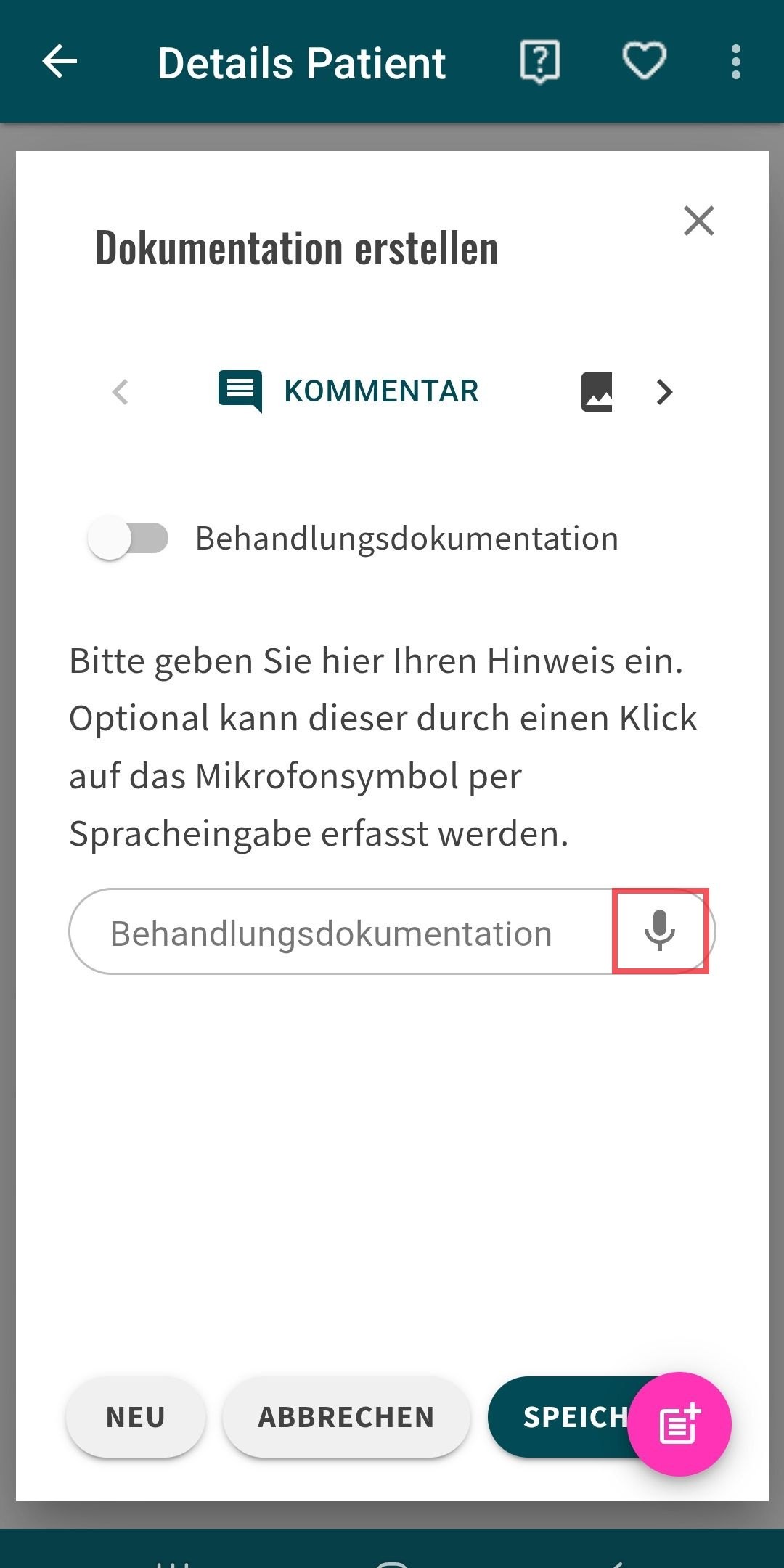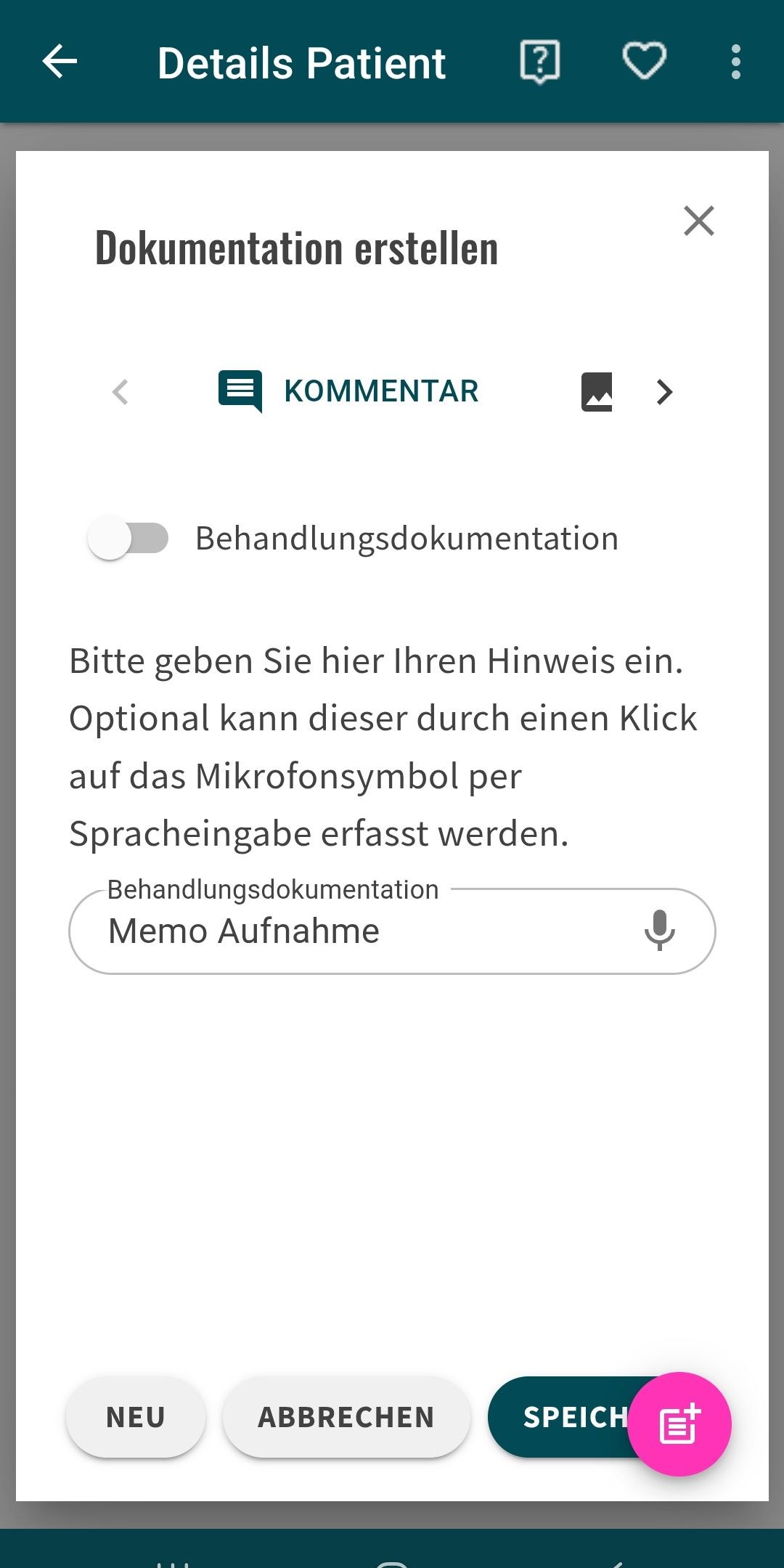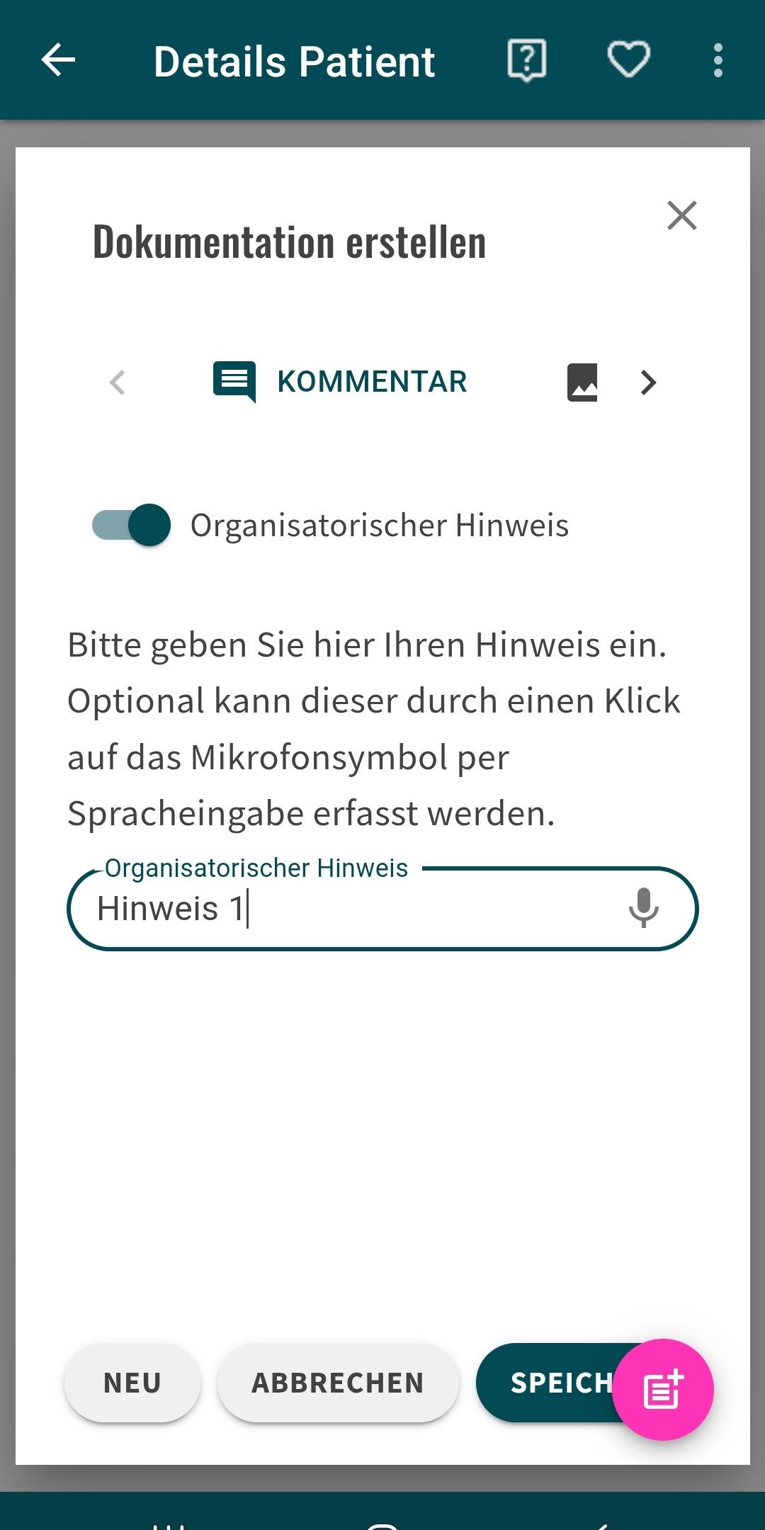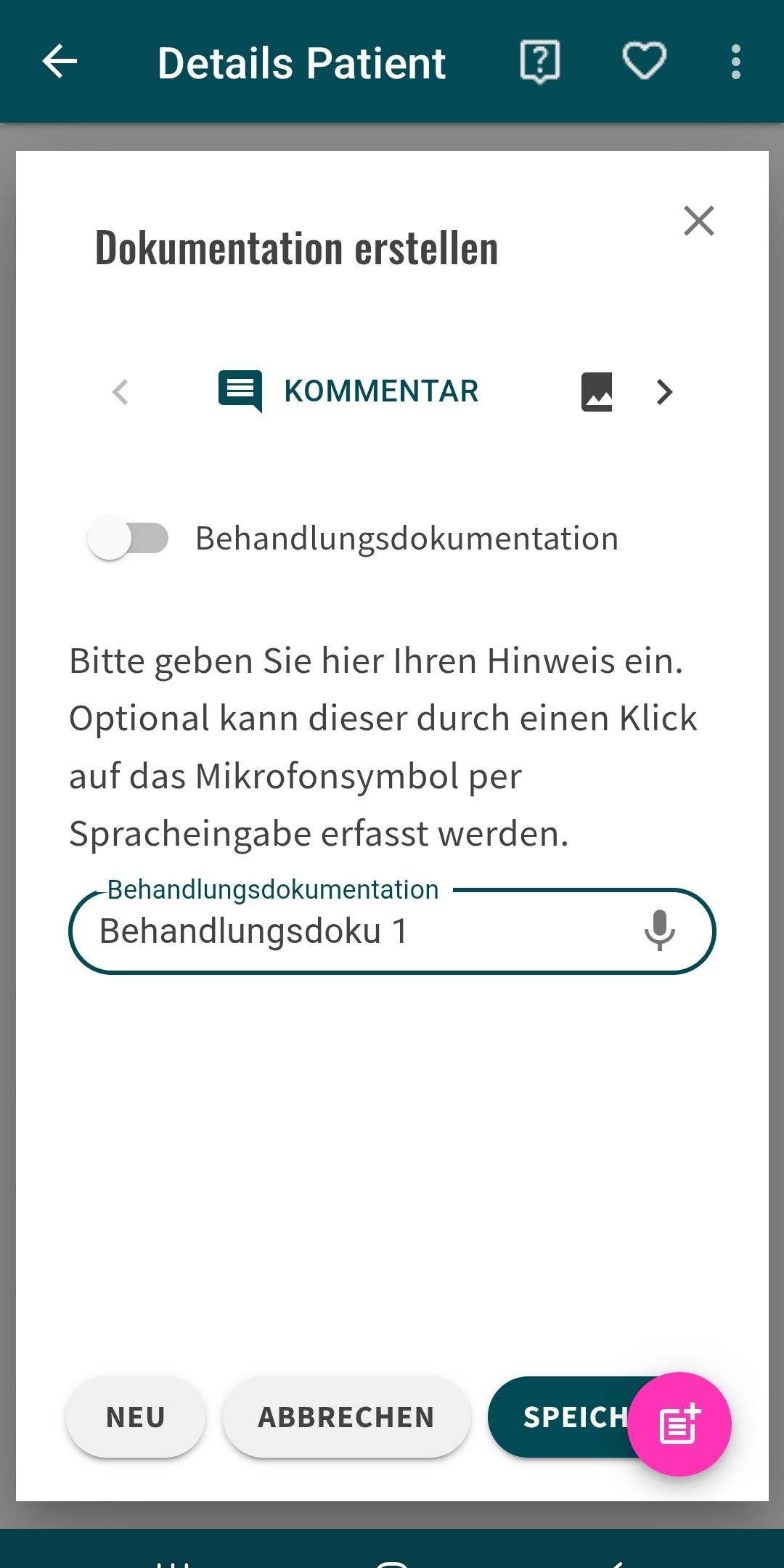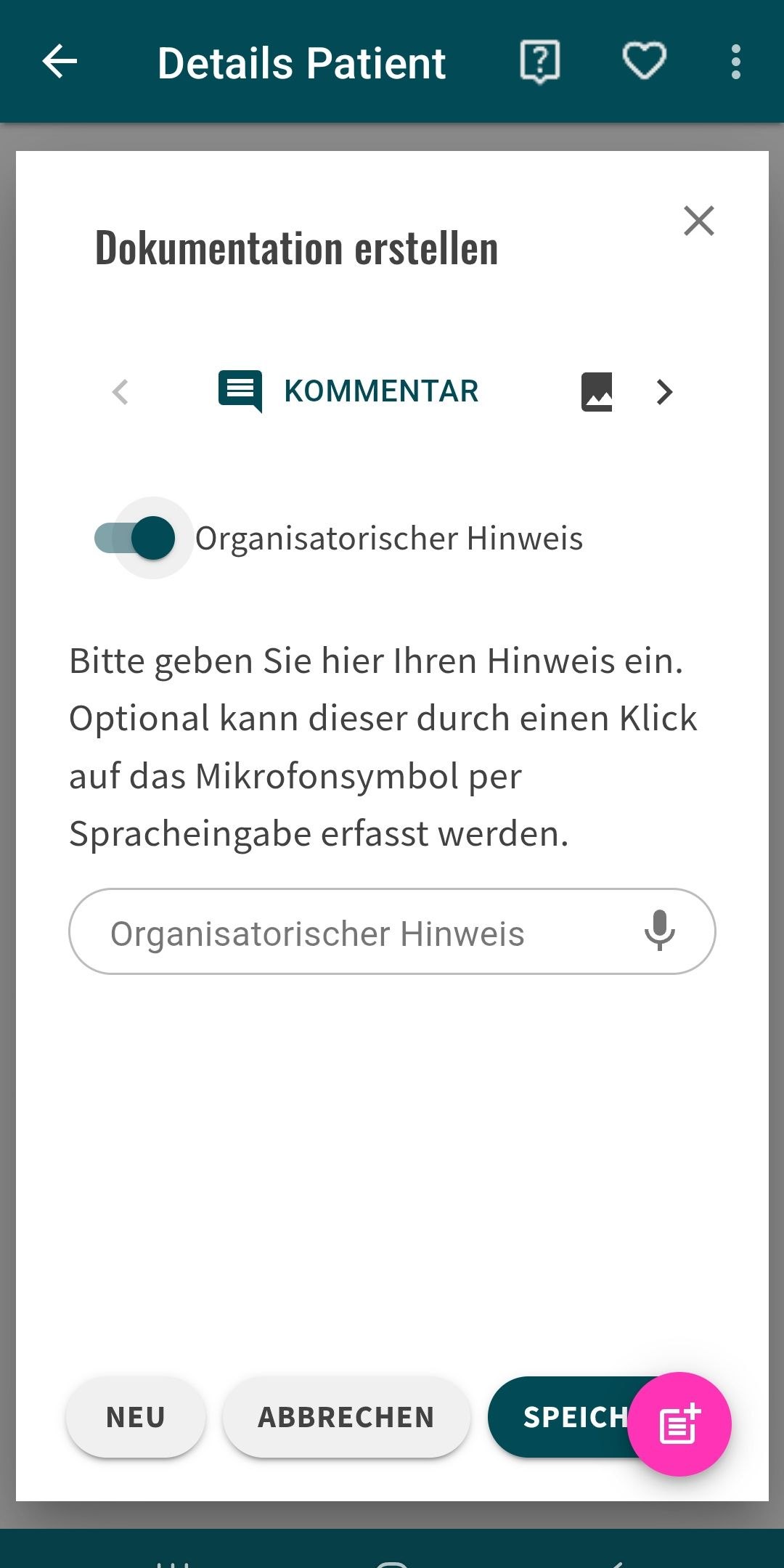 Beim beim Schieberegler hast du die Optionen „Behandlungsdokumentation“ und „Organisatorischer Hinweis“
