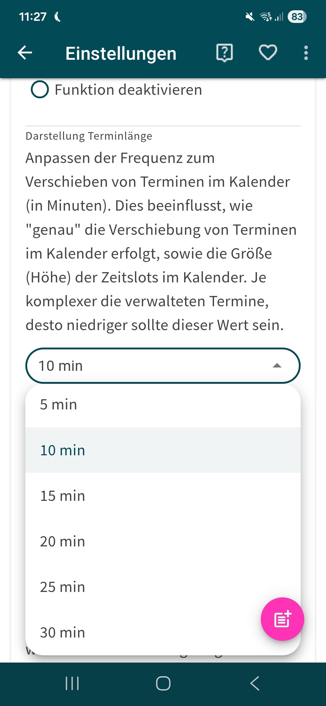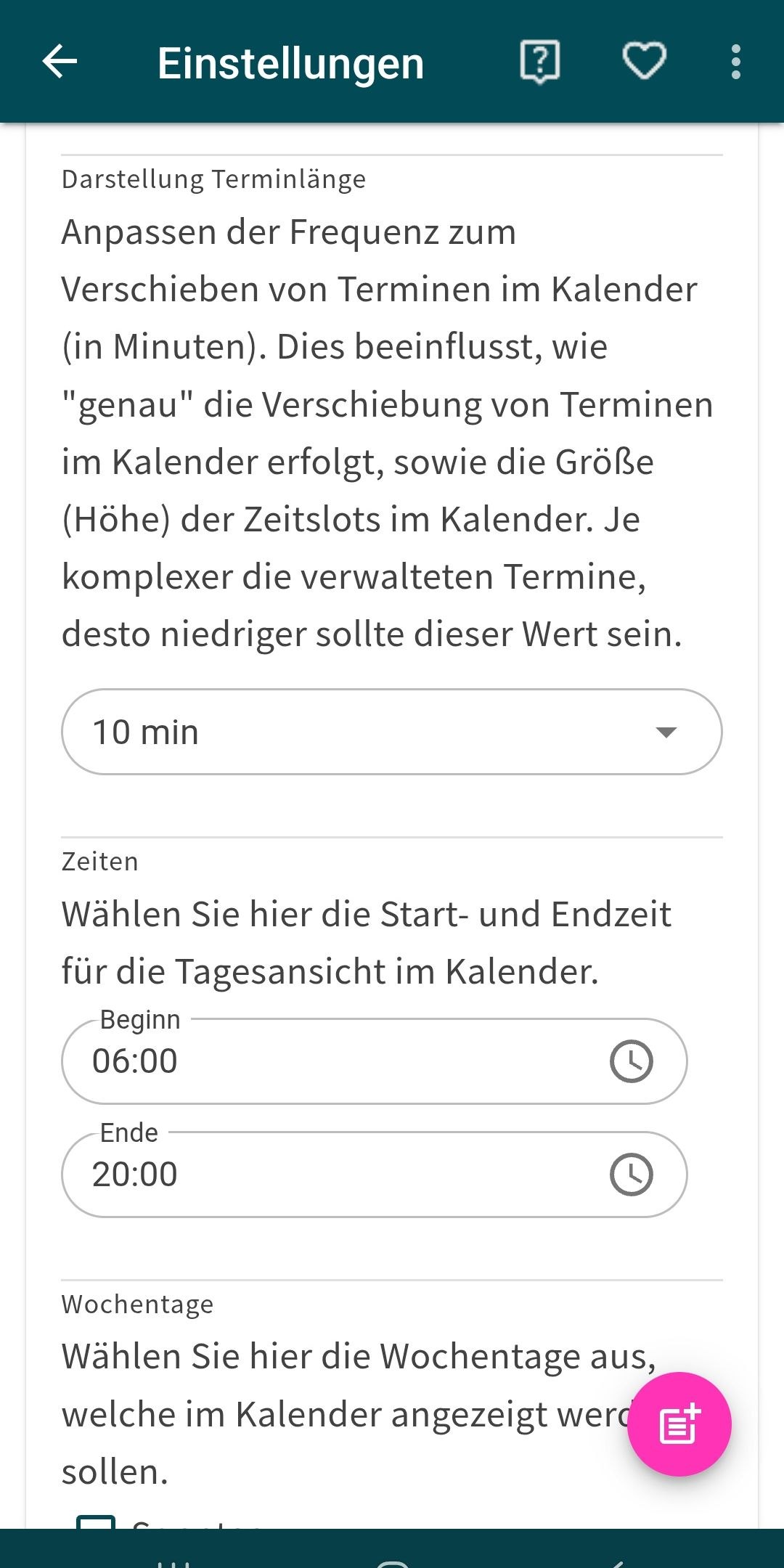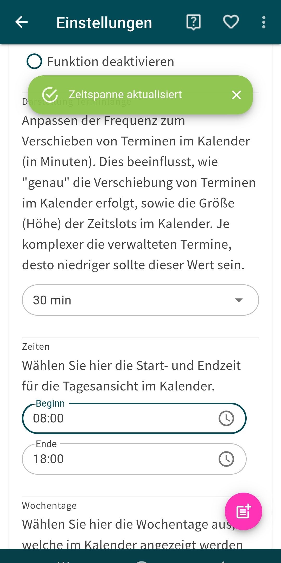 Stelle hier die Länge der im Kalender angezeigten Zeit-Slots ein