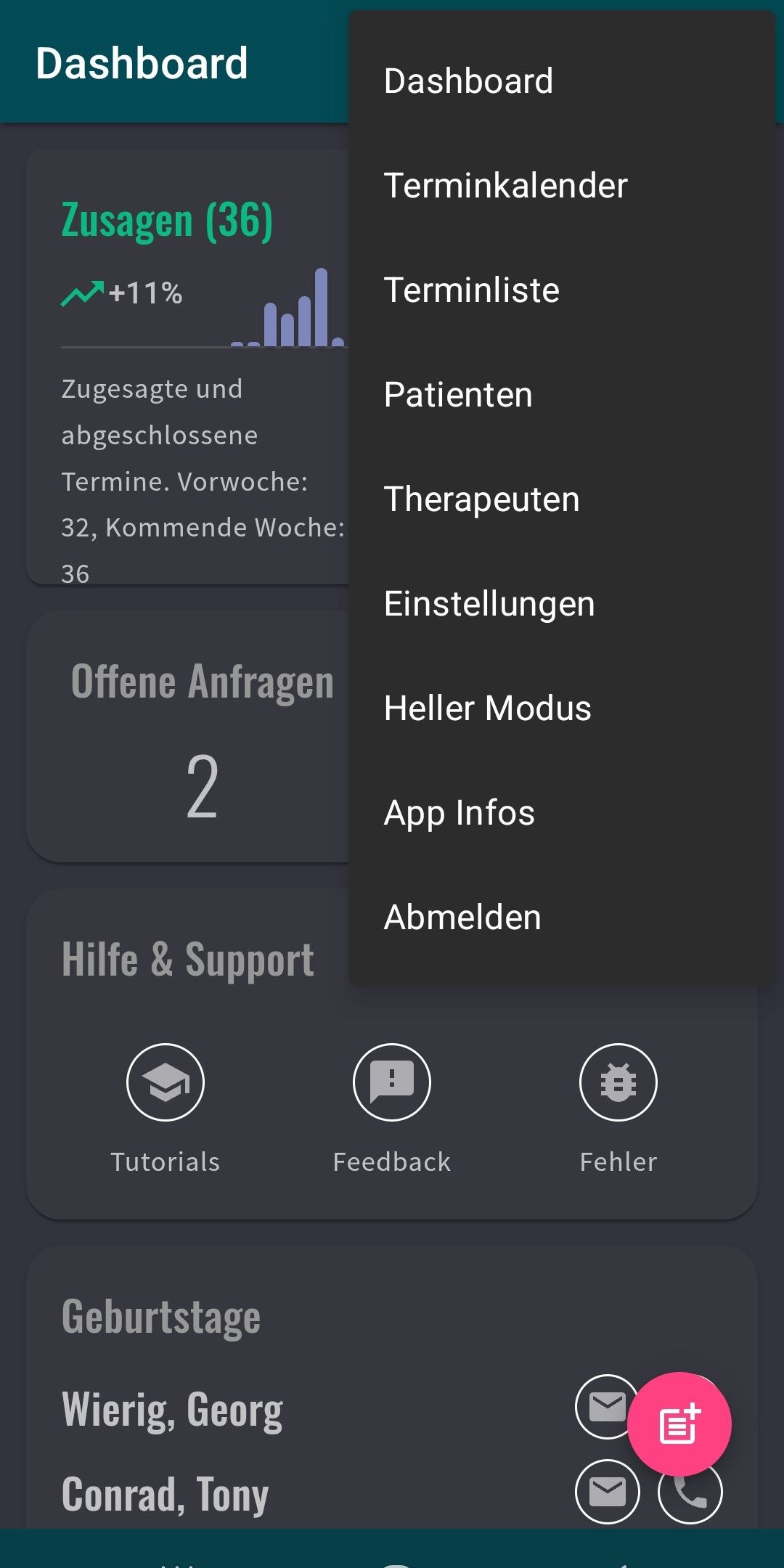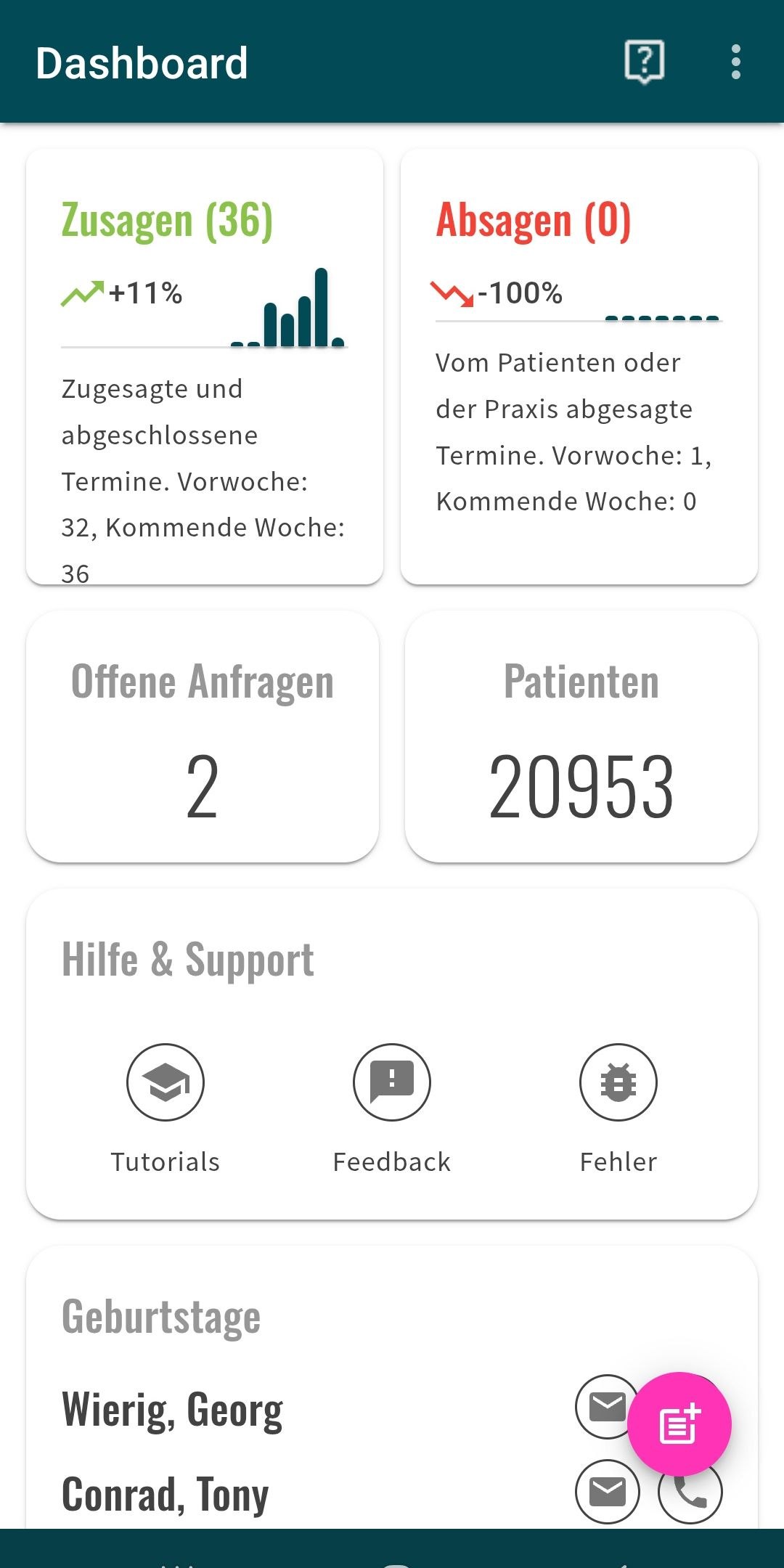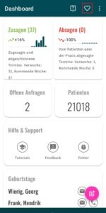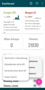 Von links nach rechts findest du dort Zusagen und Absagen sowie offene Anfragen und Patienteninfos