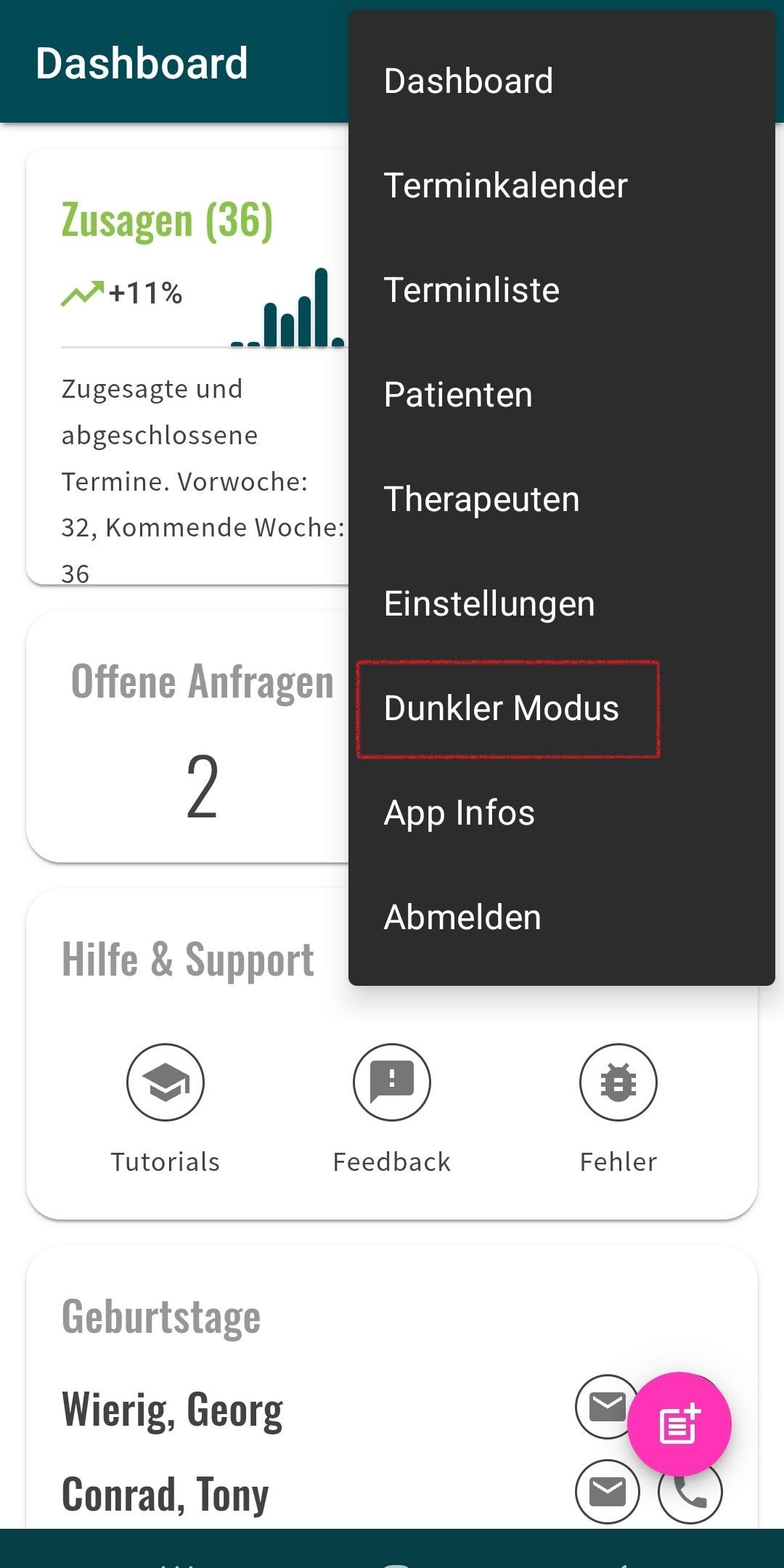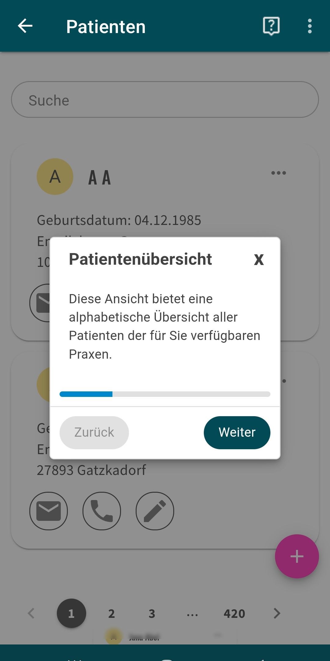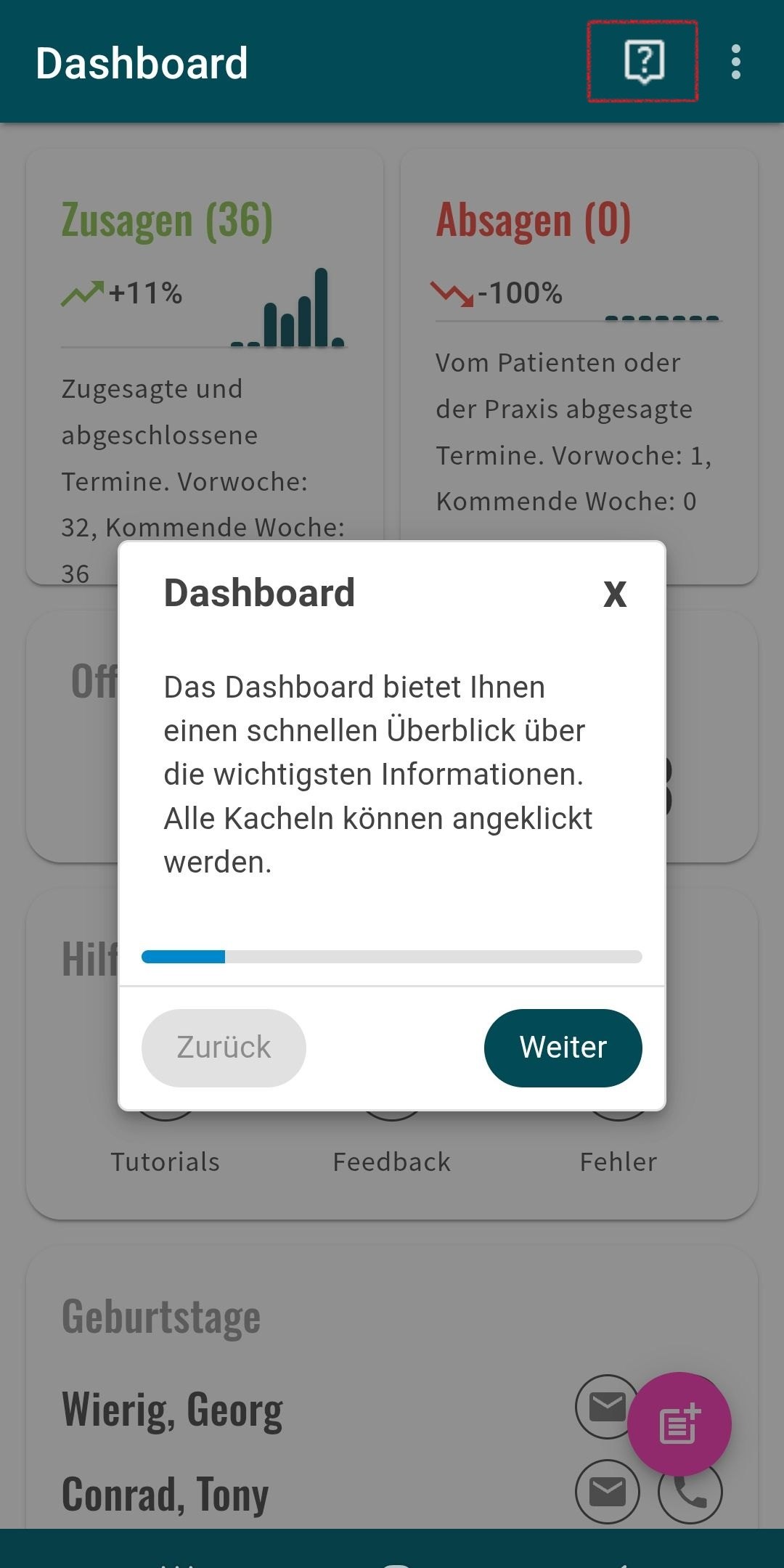 In Dashboard, Terminkalender, Terminliste, Patienten und Einstellungen befindet sich jetzt oben rechts ein kleines Fragezeichenicon, das per Tutorial die Menüführung erläutert