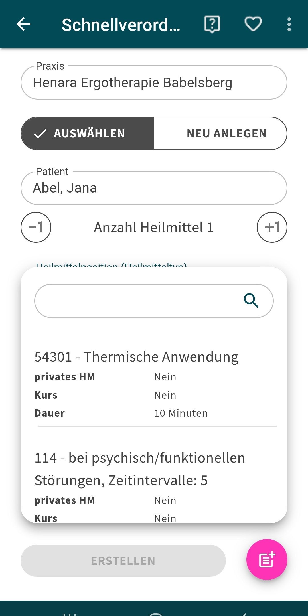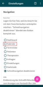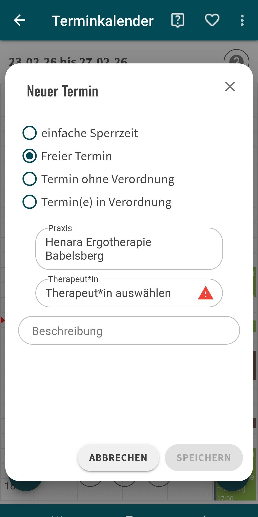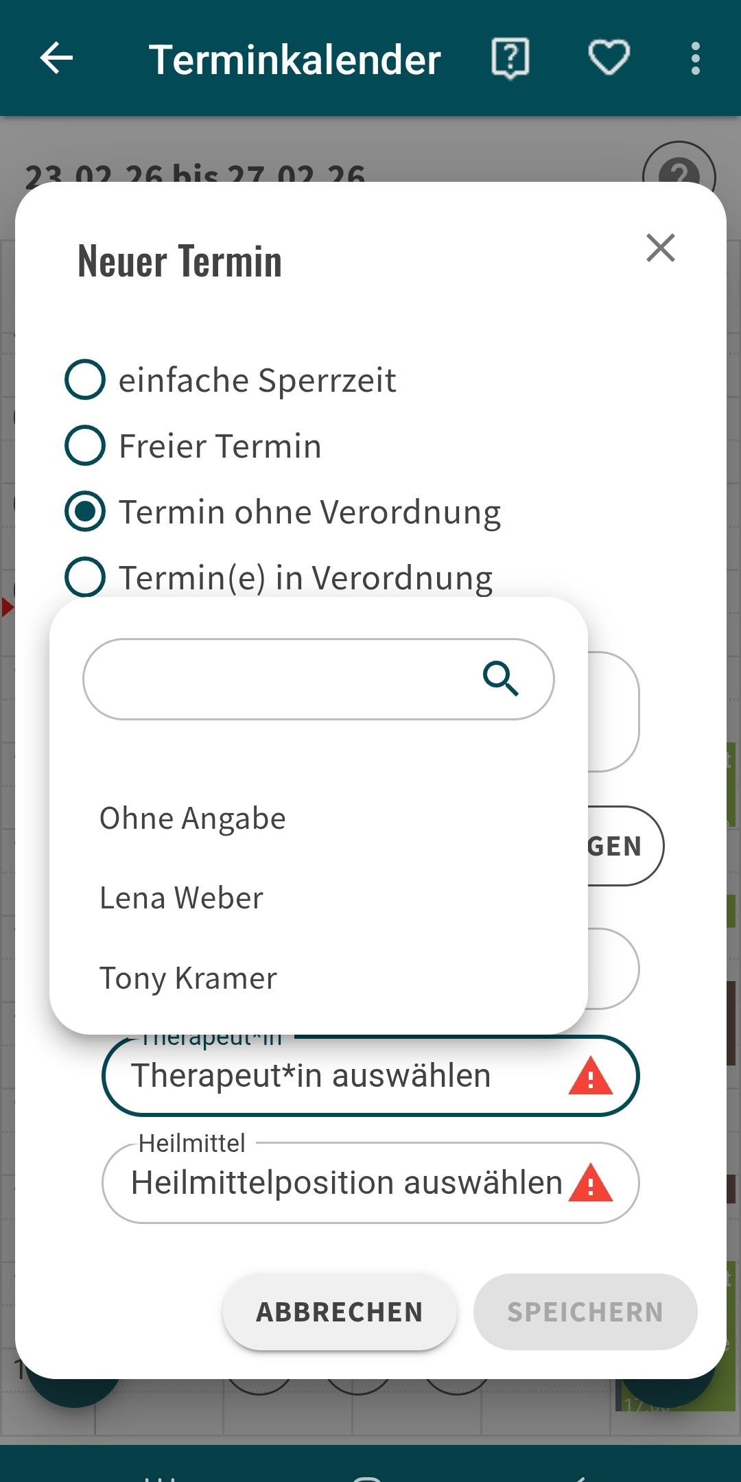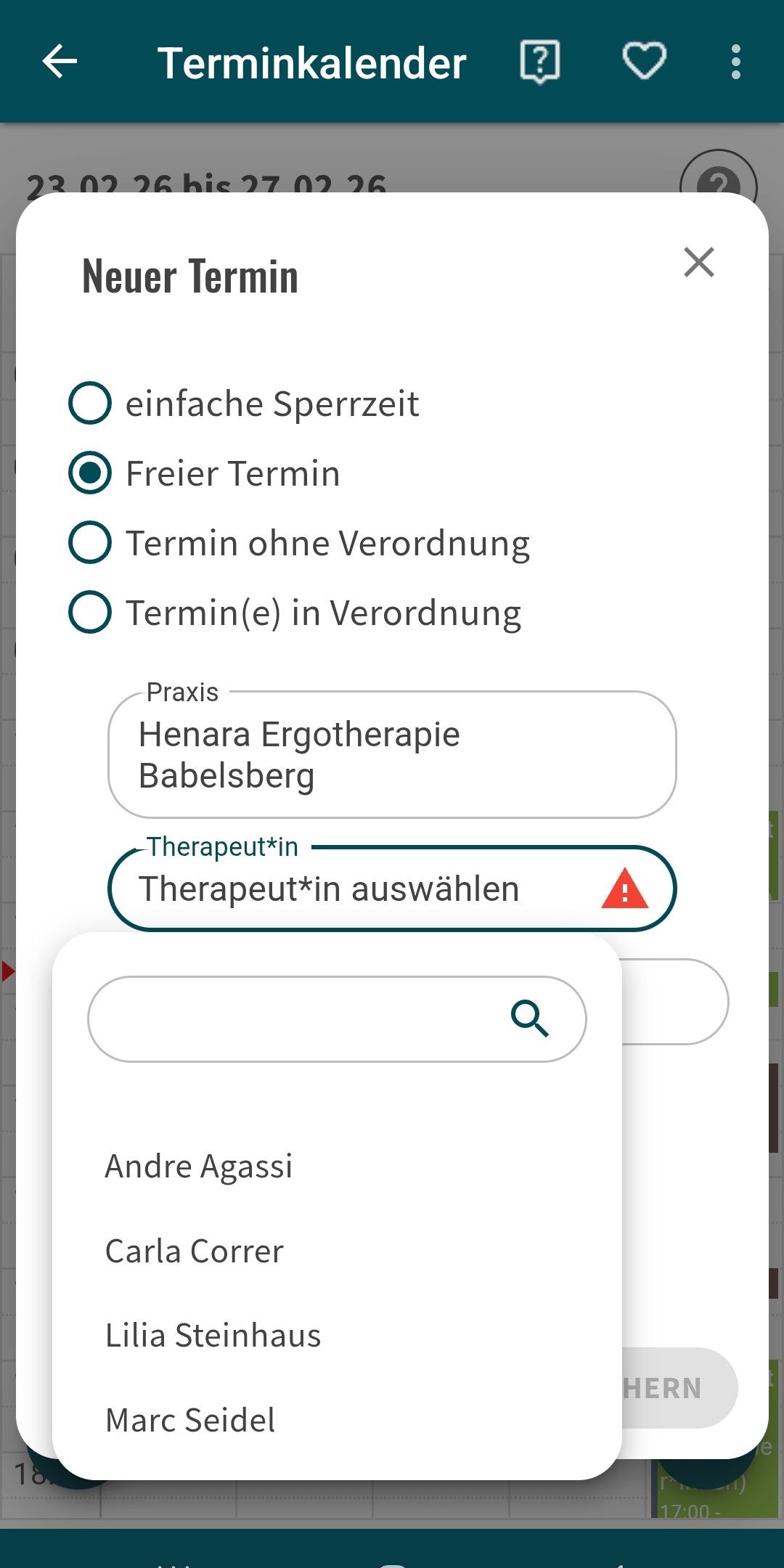 Wenn du dich zuvor nicht in der Therapeutenansicht befandest, muss neben der Praxis noch ein Therapeut ausgewählt werden