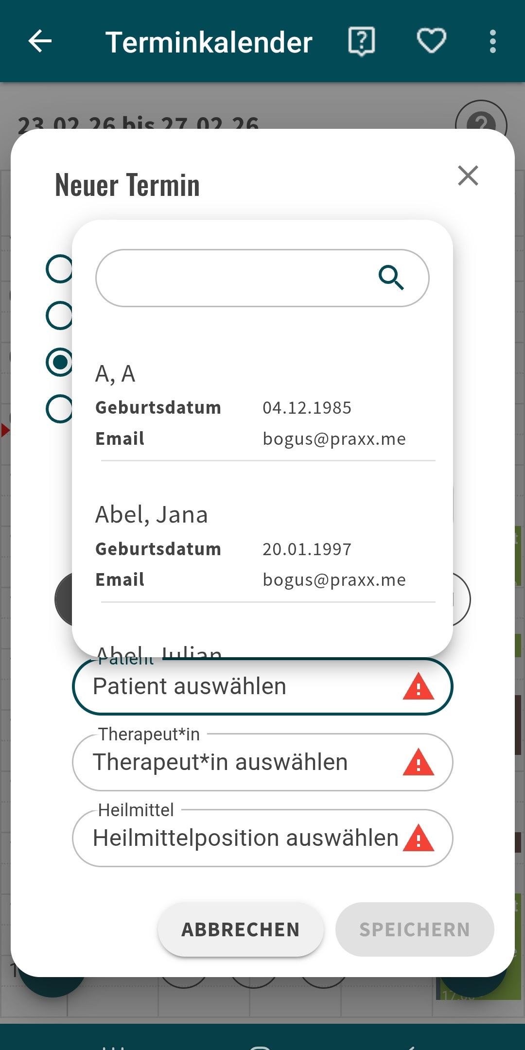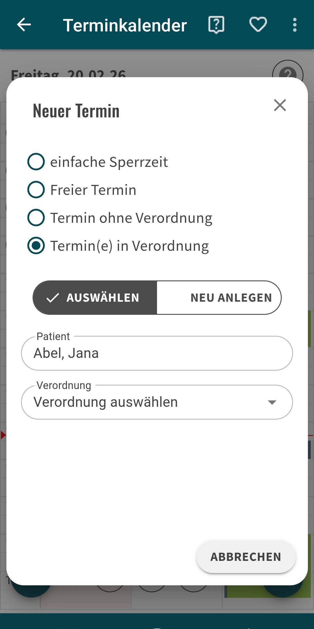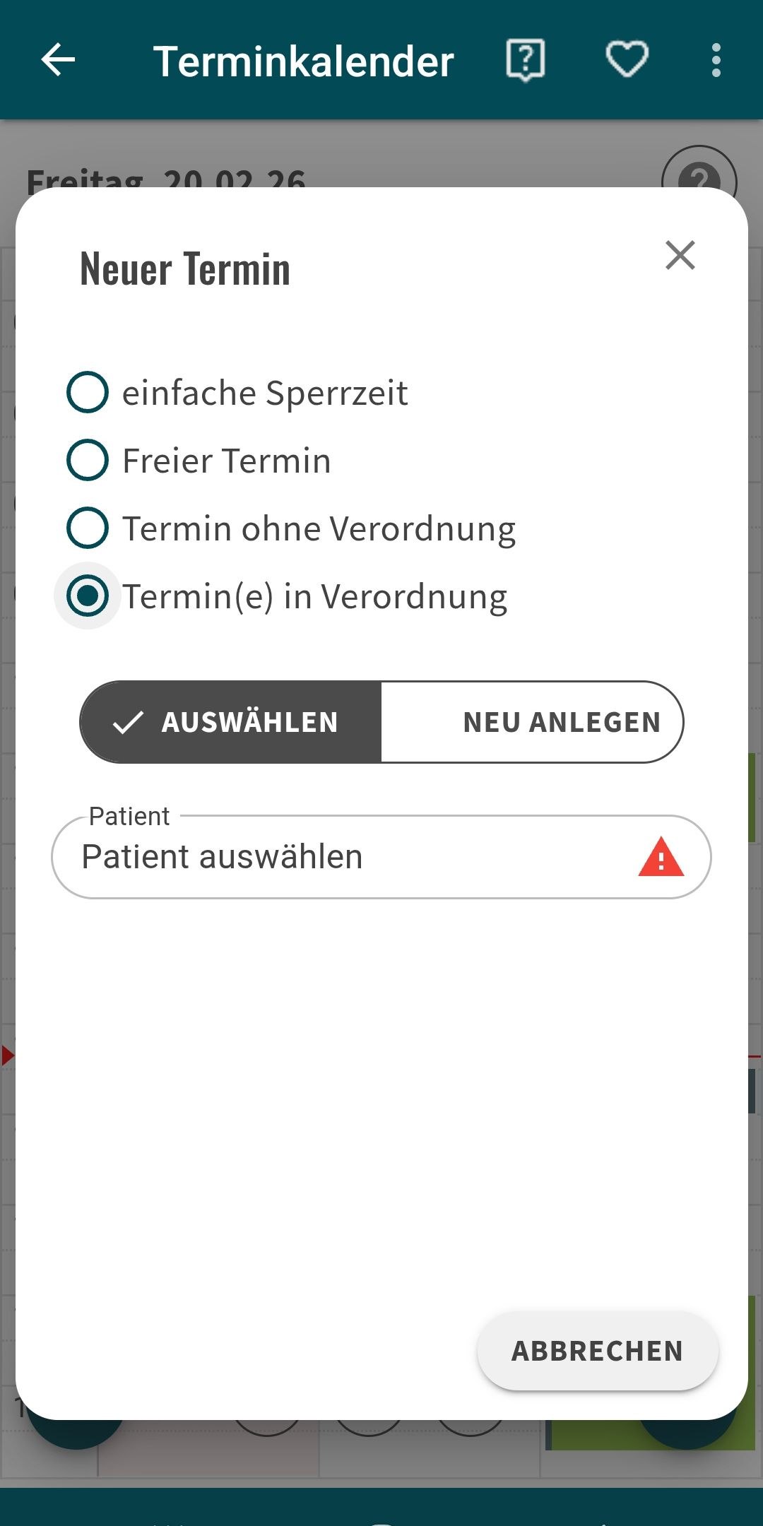 Selektiere danach aus bestehenden Patienten den richtigen Termin („Auswählen“) oder lege einen neuen an („Neu anlegen“)