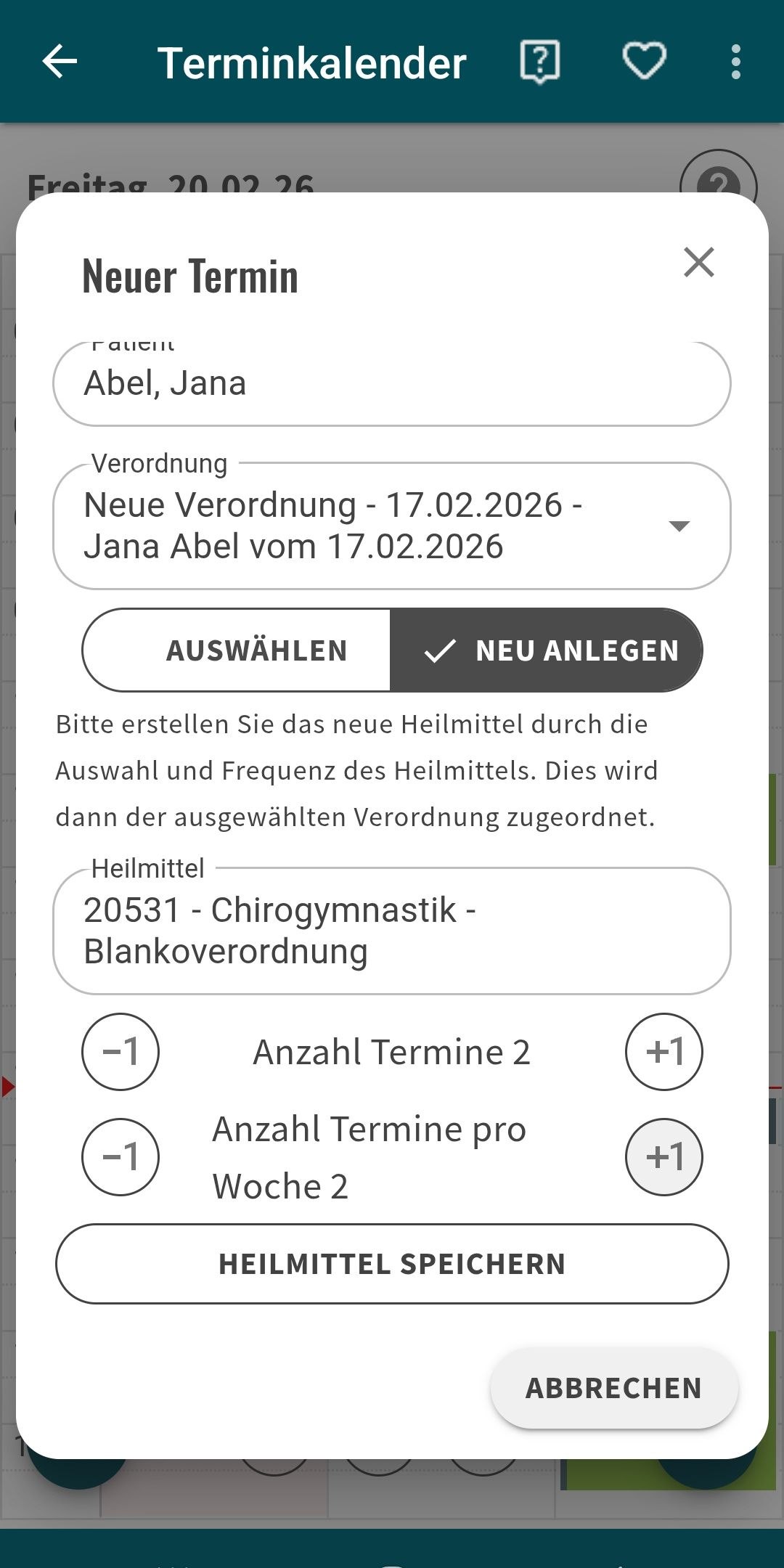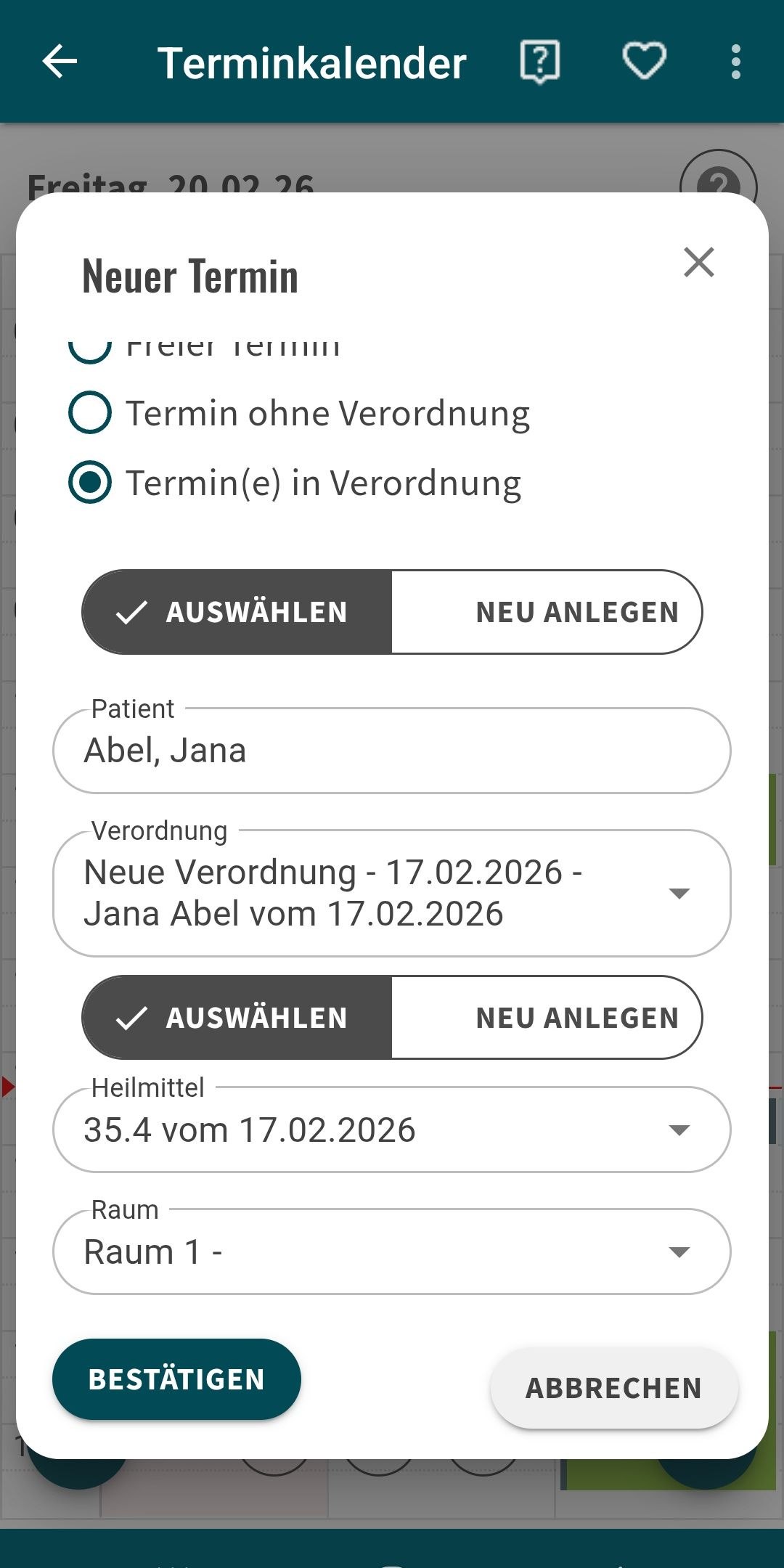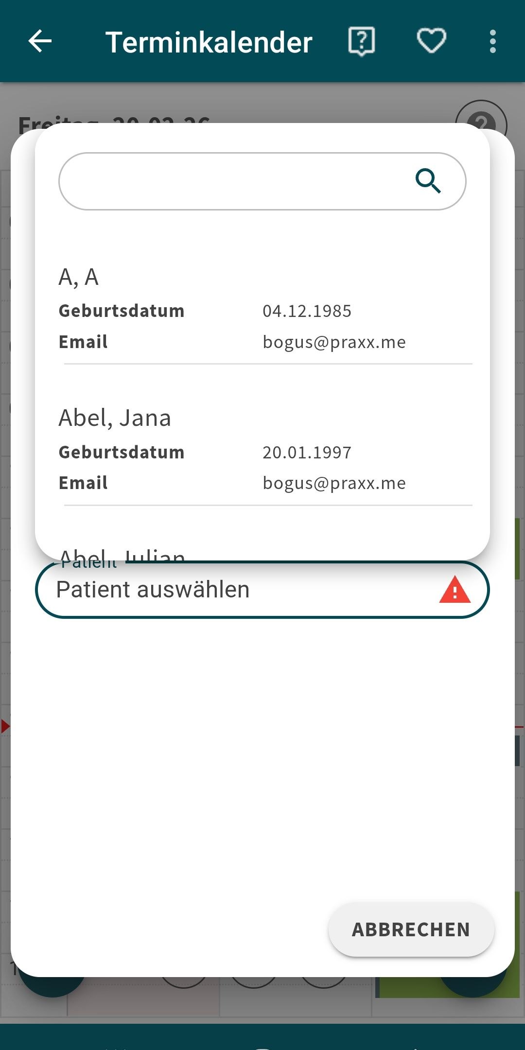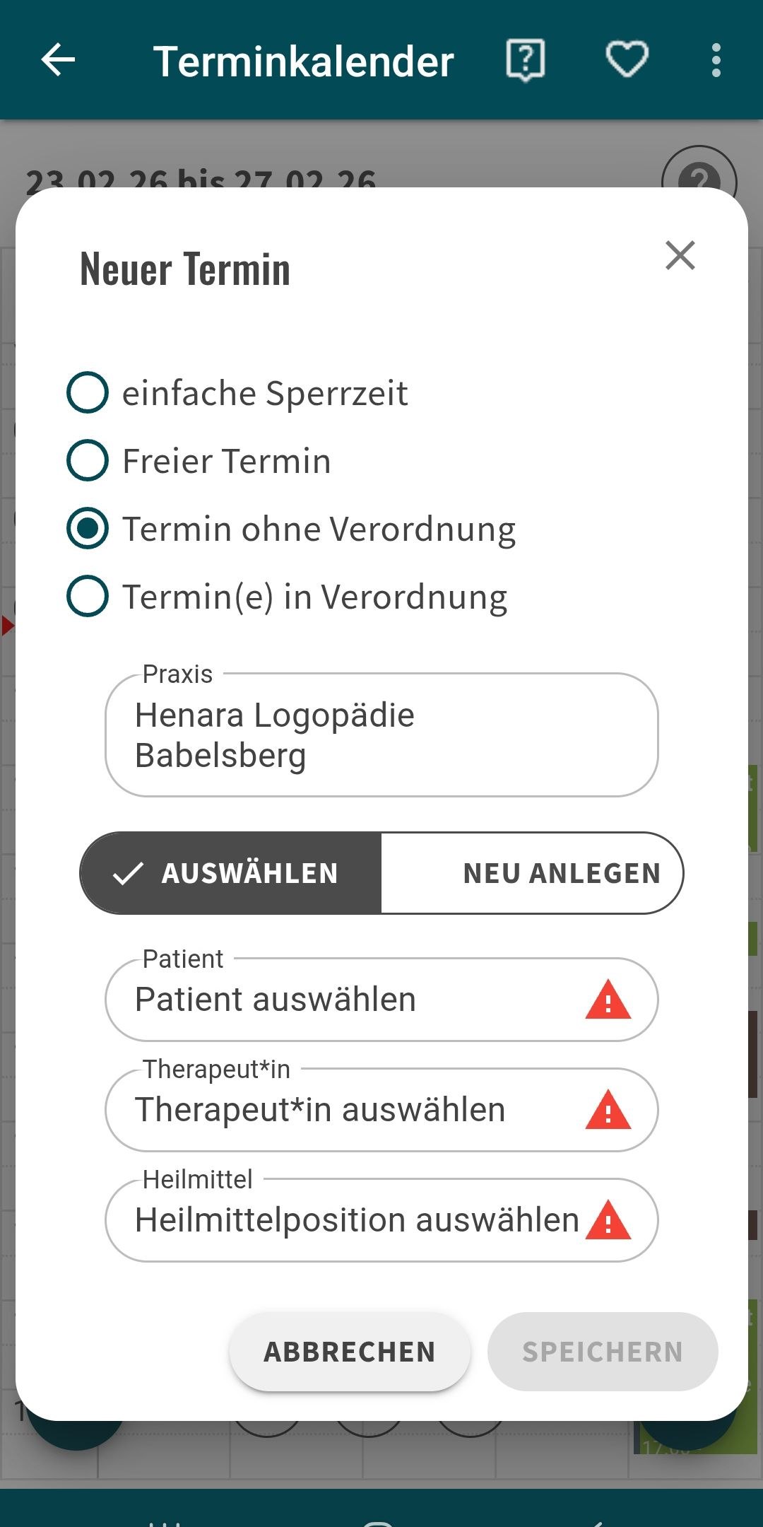 Selektiere danach aus bestehenden Patienten den richtigen Termin („Auswählen“) oder lege einen neuen an („Neu anlegen“)