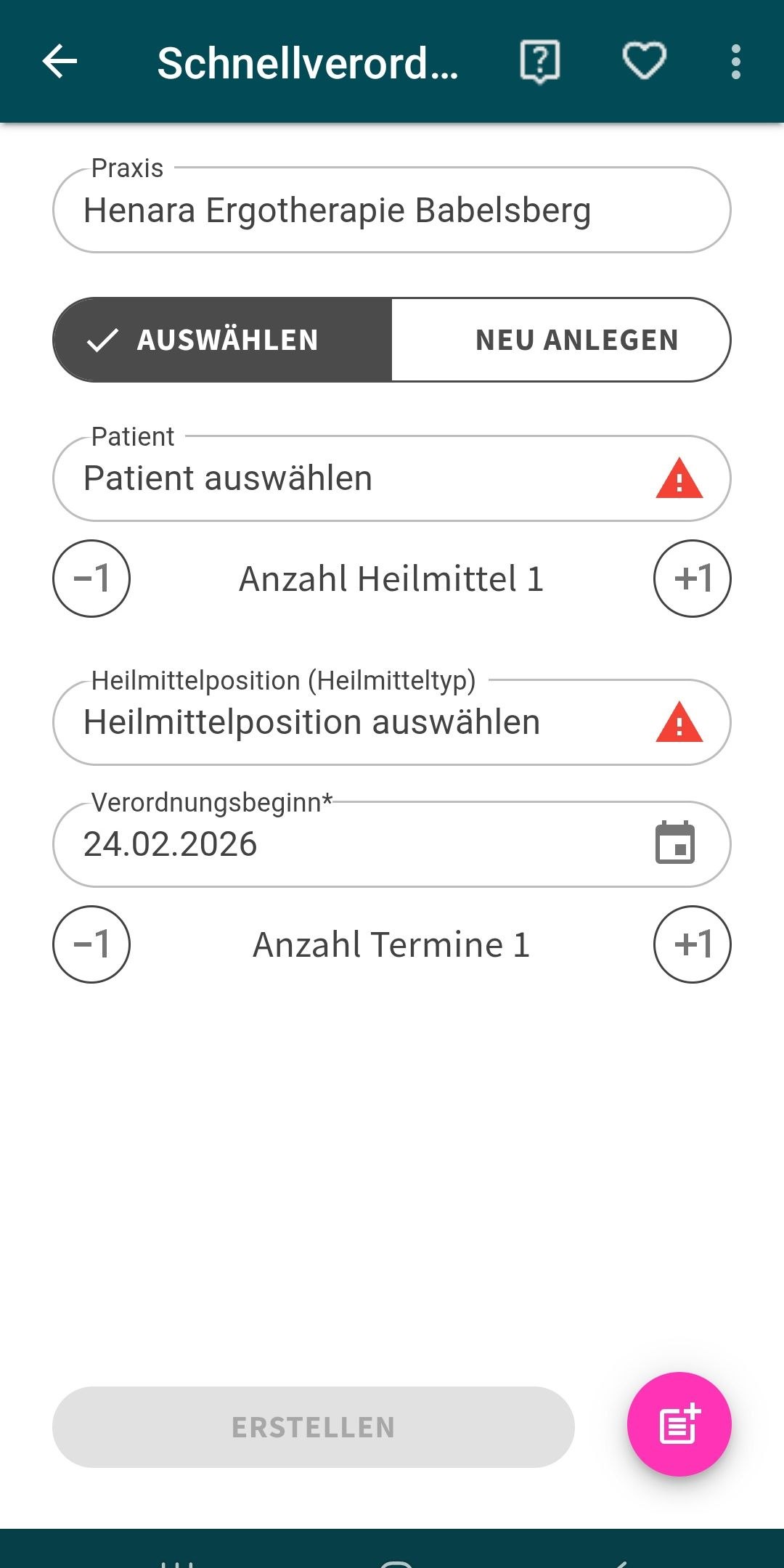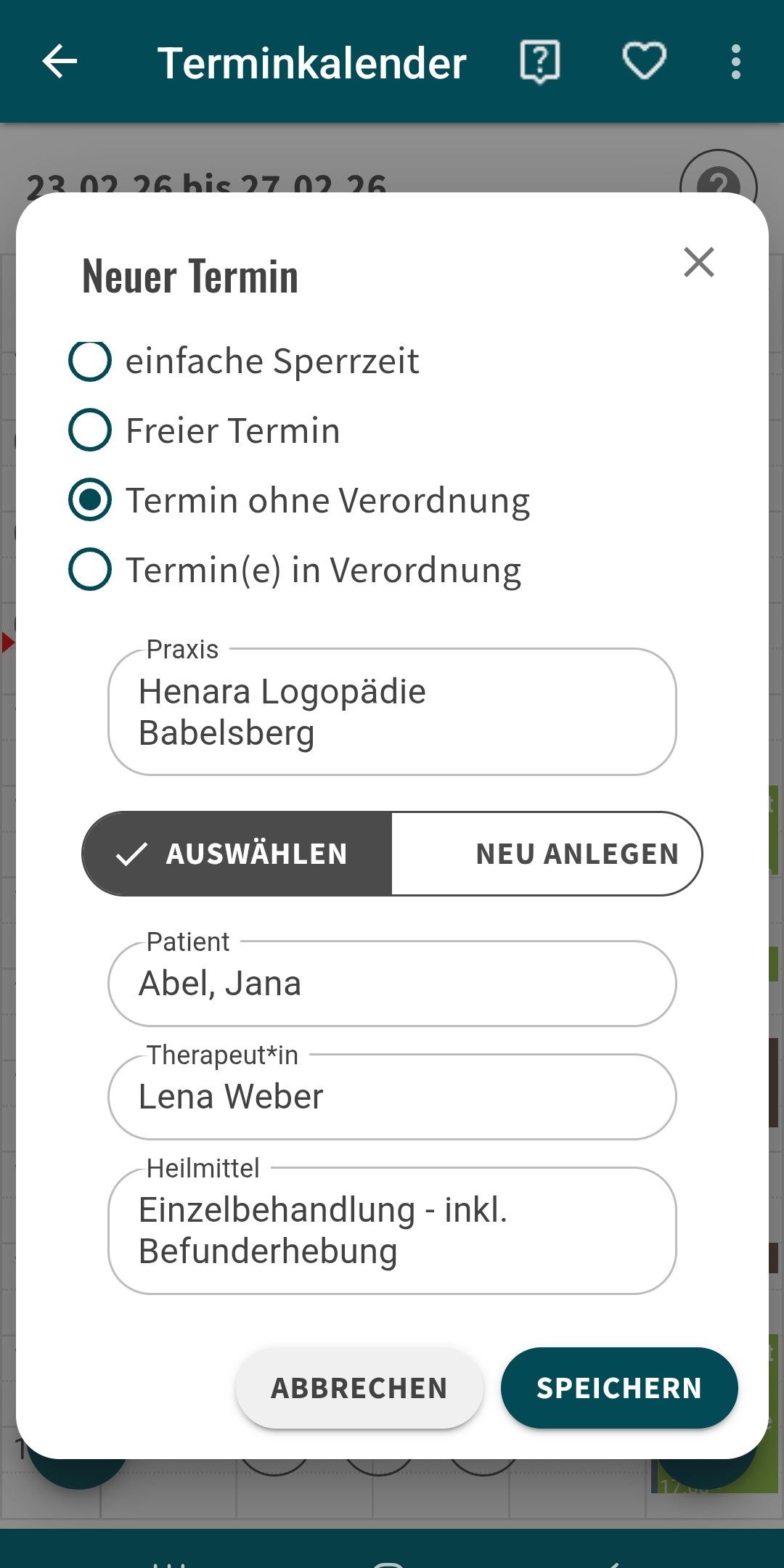 Wähle unter Patient einen bestehenden („Auswählen“) oder lege einen neuen an („Neu anlegen“)