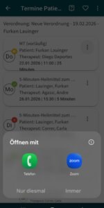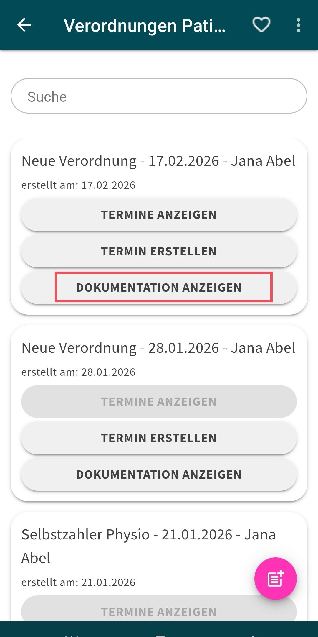 Zu jeder Verordnung gibt es die Menüpunkte „Termine anzeigen“, „Termin erstellen“ und „Dokumentation anzeigen“