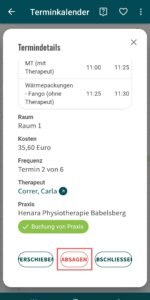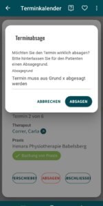 Gib im Fenster „Terminabsage“ einen Absagegrund ein und bestätige mit „Absagen“