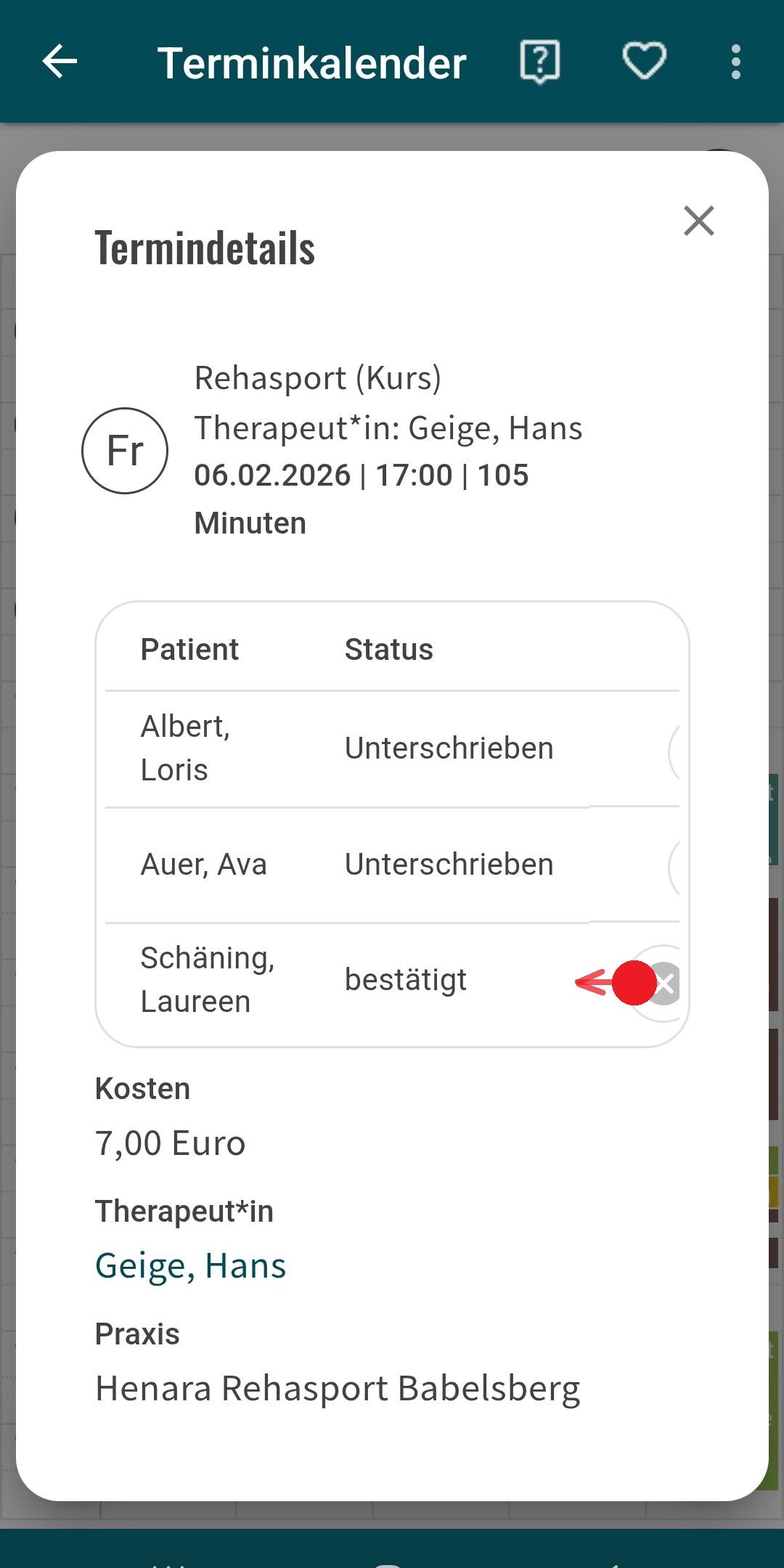 Außerdem erscheint der Patient nun mit dem Status „unterschrieben“ in den Kursinformationen.
