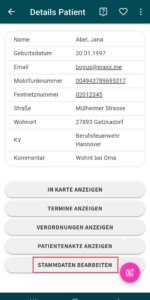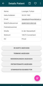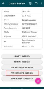 - Nun öffnet sich „Details Patient“ mit verschiedenen Infos zum Patienten