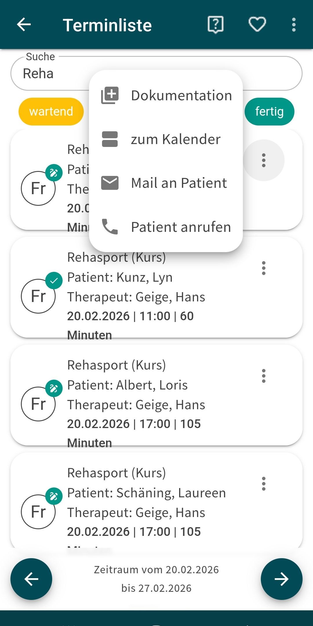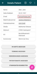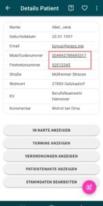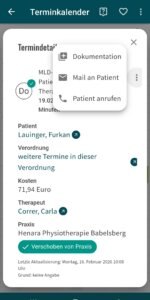 Tippst du hier drauf, findest du Links zu folgenden Menüpunkten: „Dokumentation“, „Zum Kalender“, „Mail an Patient“ und „Patient anrufen“ (siehe unten)