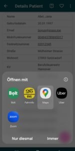 Wähle eine Karten-App wie. „Maps“, bestätige deine Auswahl und du wirst zur Adresse des Patienten weitergeleitet
