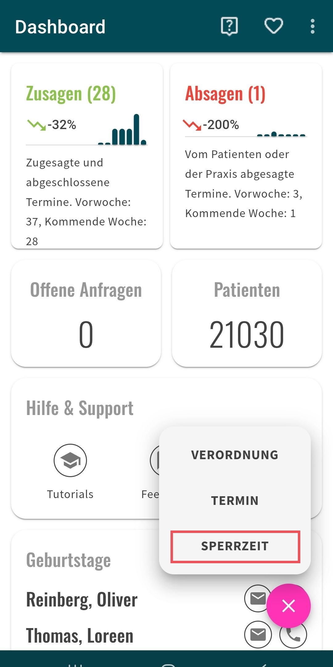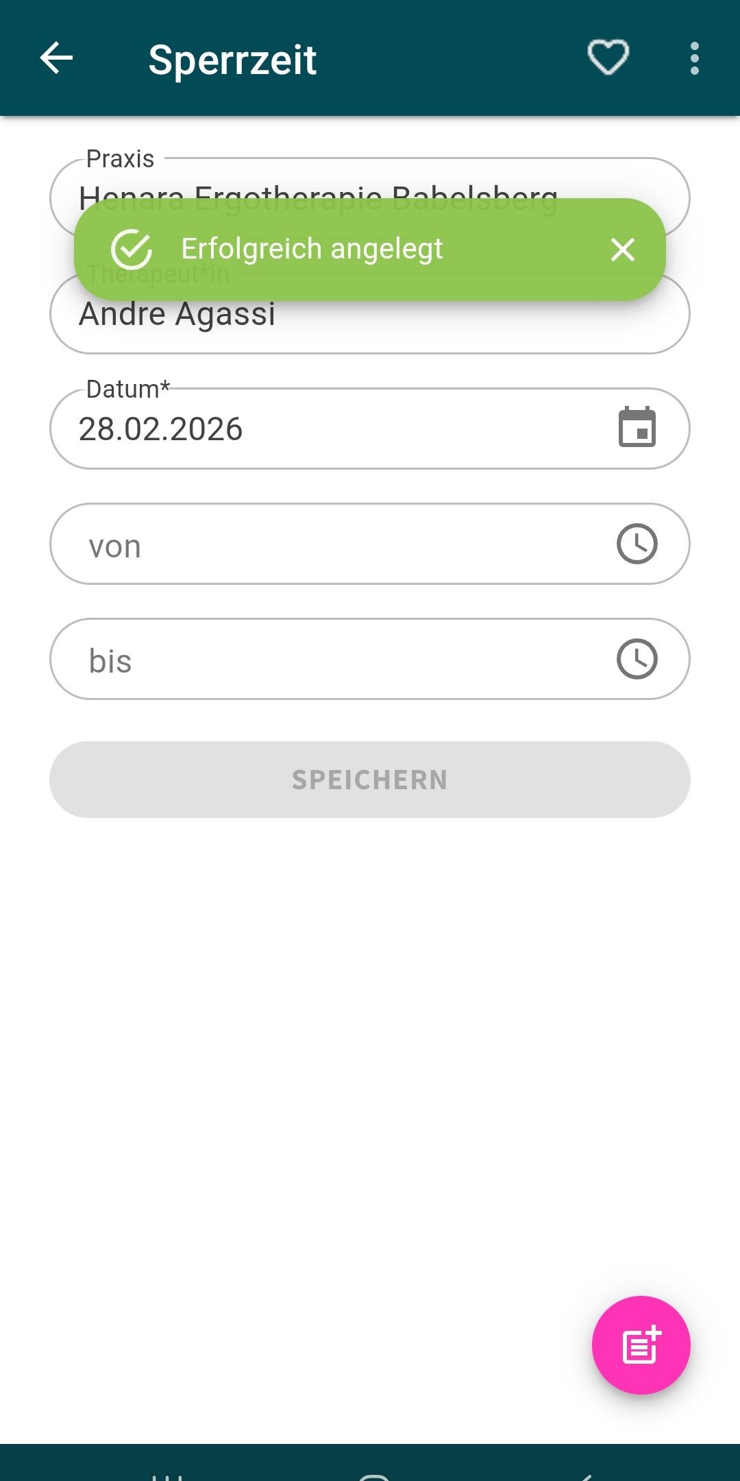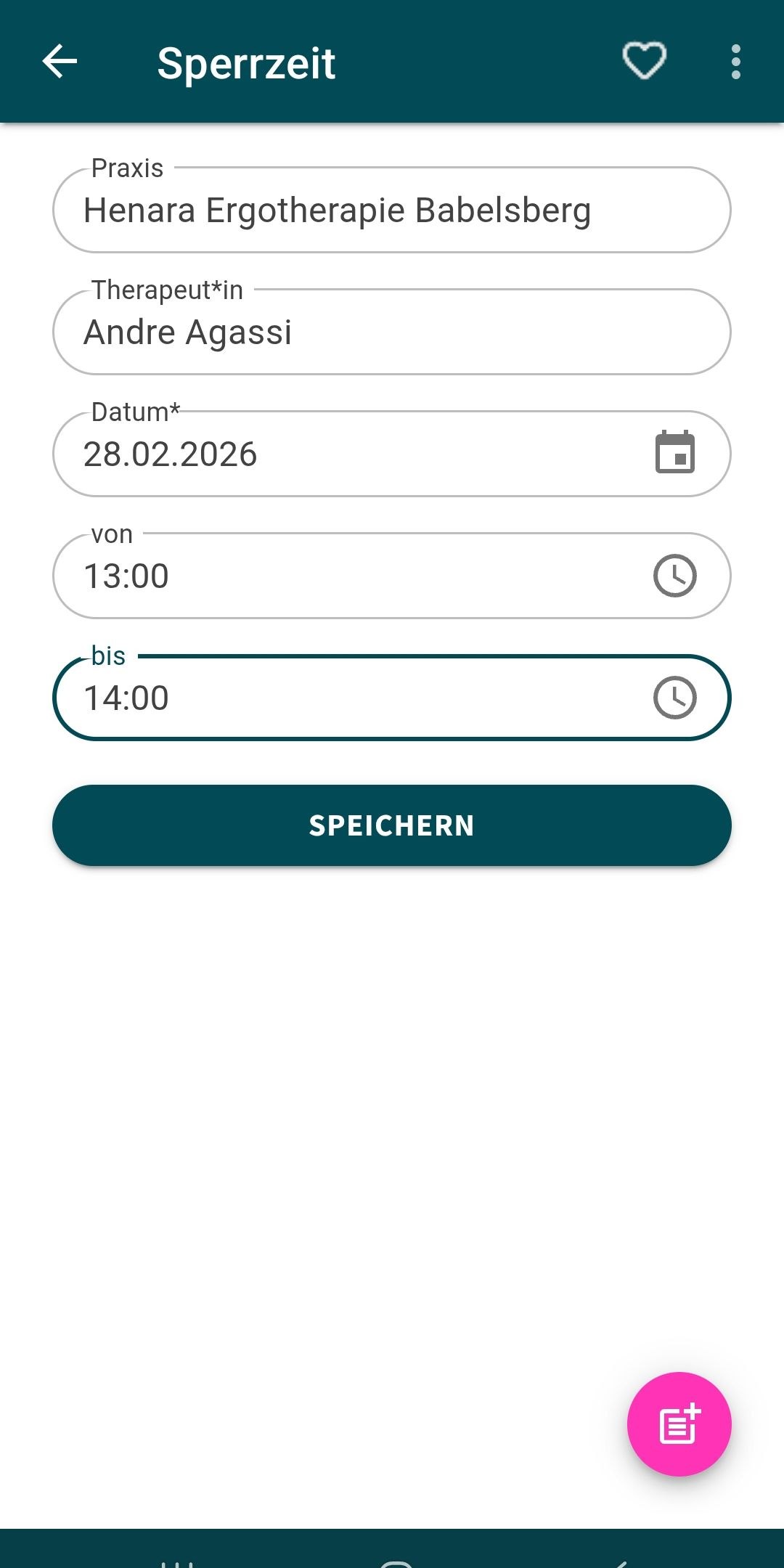 Wenn du „Sperrzeit“ auswählst, kannst du für einen bestimmten Therapeuten eine Zeit einrichten, in der er für Termine nicht zur Verfügung steht