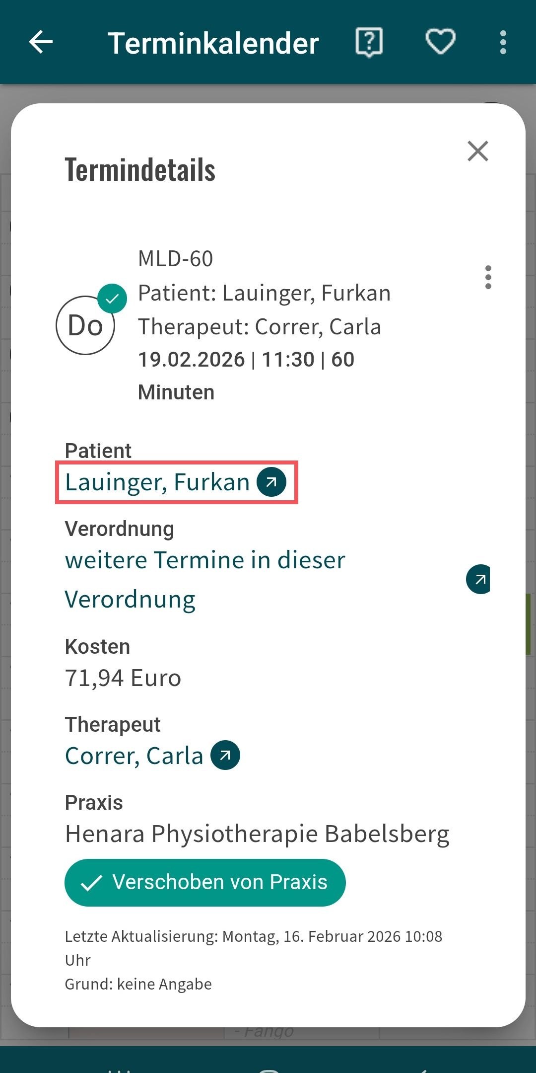 Wenn du den Termin nun erneut anwählst , findest du unter dem veränderten Terminstatus nun auch ein Feld, in dem in kleiner Schrift neben dem genauen Zeitpunkt auch der Grund der Verschiebung steht
