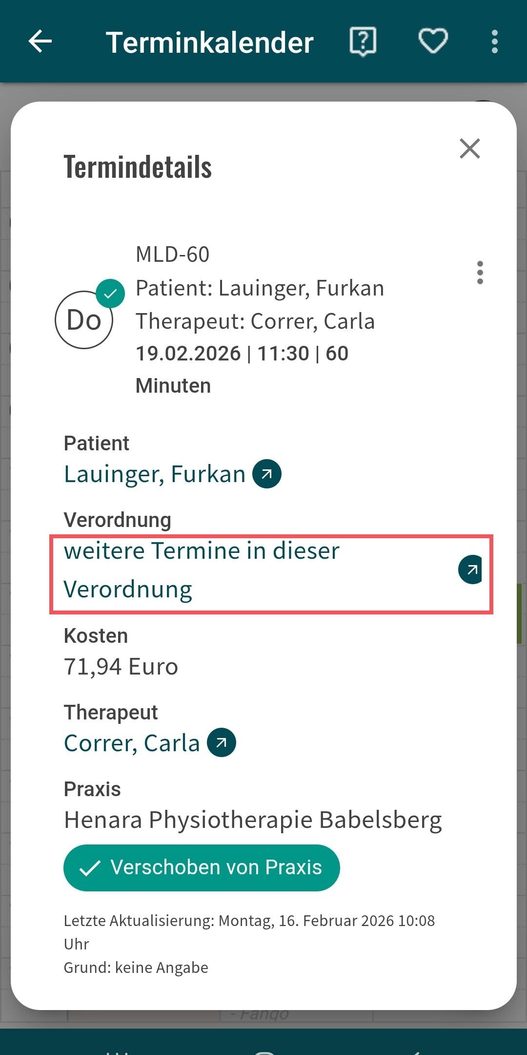 Wenn du einen Termin in einer Verordnung erstellen möchtest, kehre in das Menü Verordnungen Patient“ zurück (mehr dazu s. „Termin in Verordnung erstellen“)