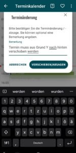Gib einen Grund der Verschiebung ein und bestätige. Du gelangst wieder zum Kalender