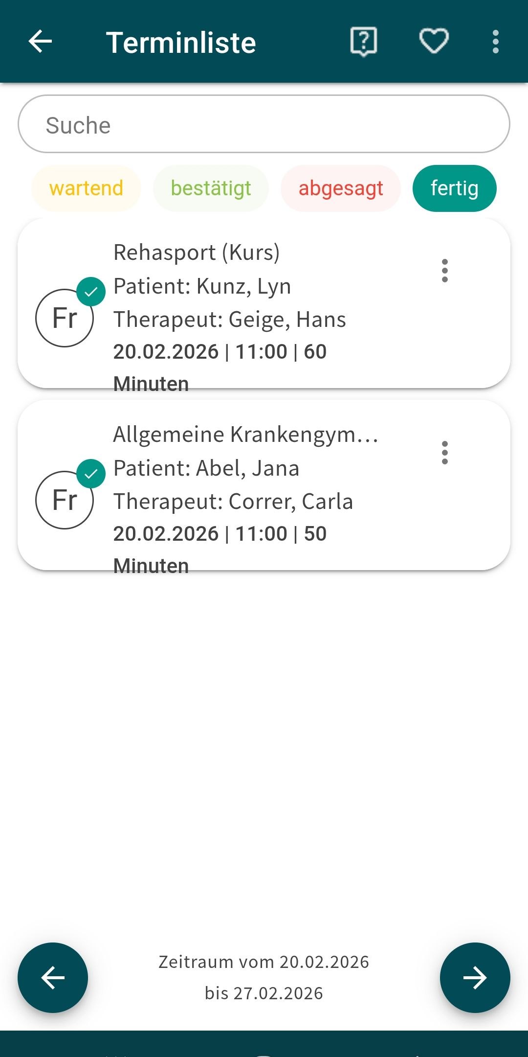 Unterhalb der Suchleiste kannst du die Terminliste nach Status filtern, z.B. nur fertige Termine anzeigen lassen