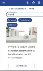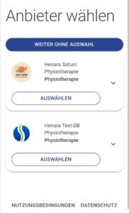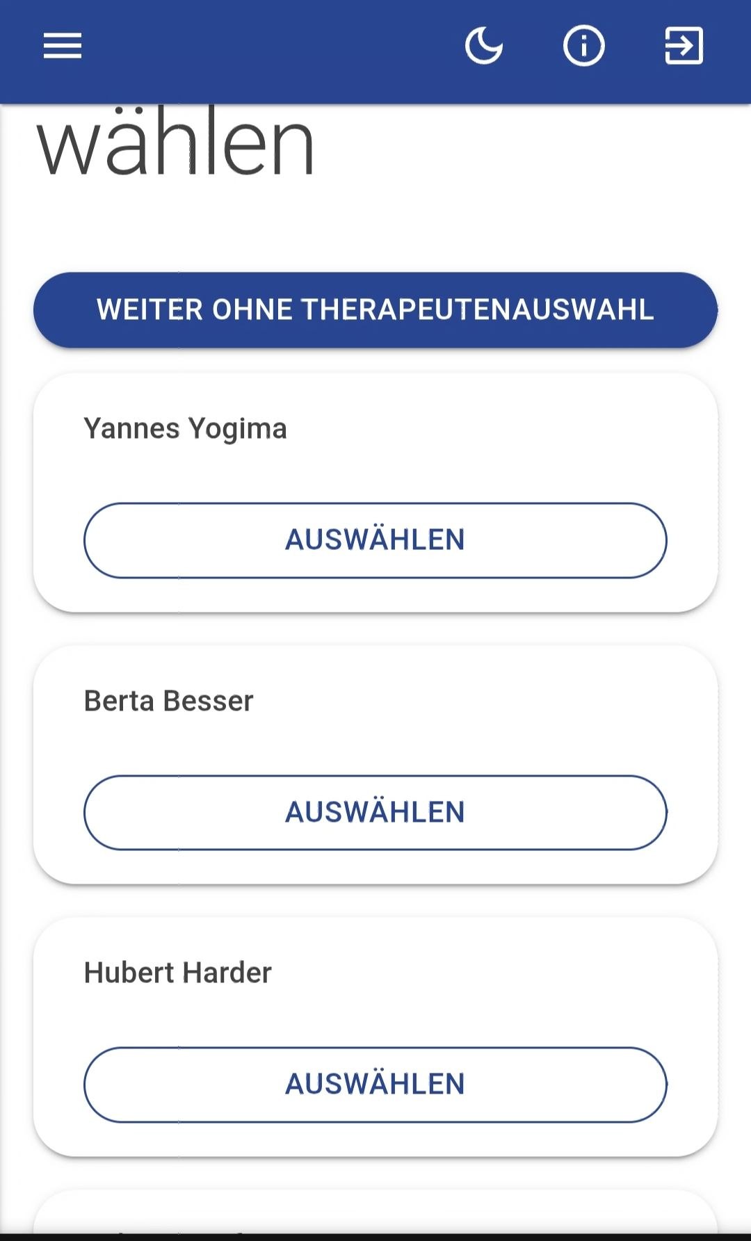 • Der nächste Schritt führt ihn zur Therapeutenwahl. Der Patient kann diesen Schritt auch ohne Auswahl fortsetzen.