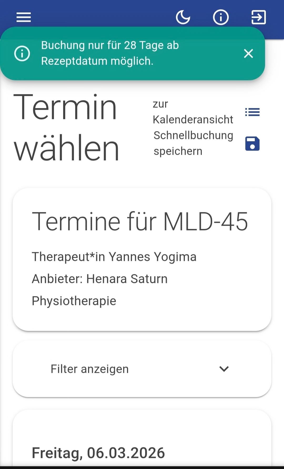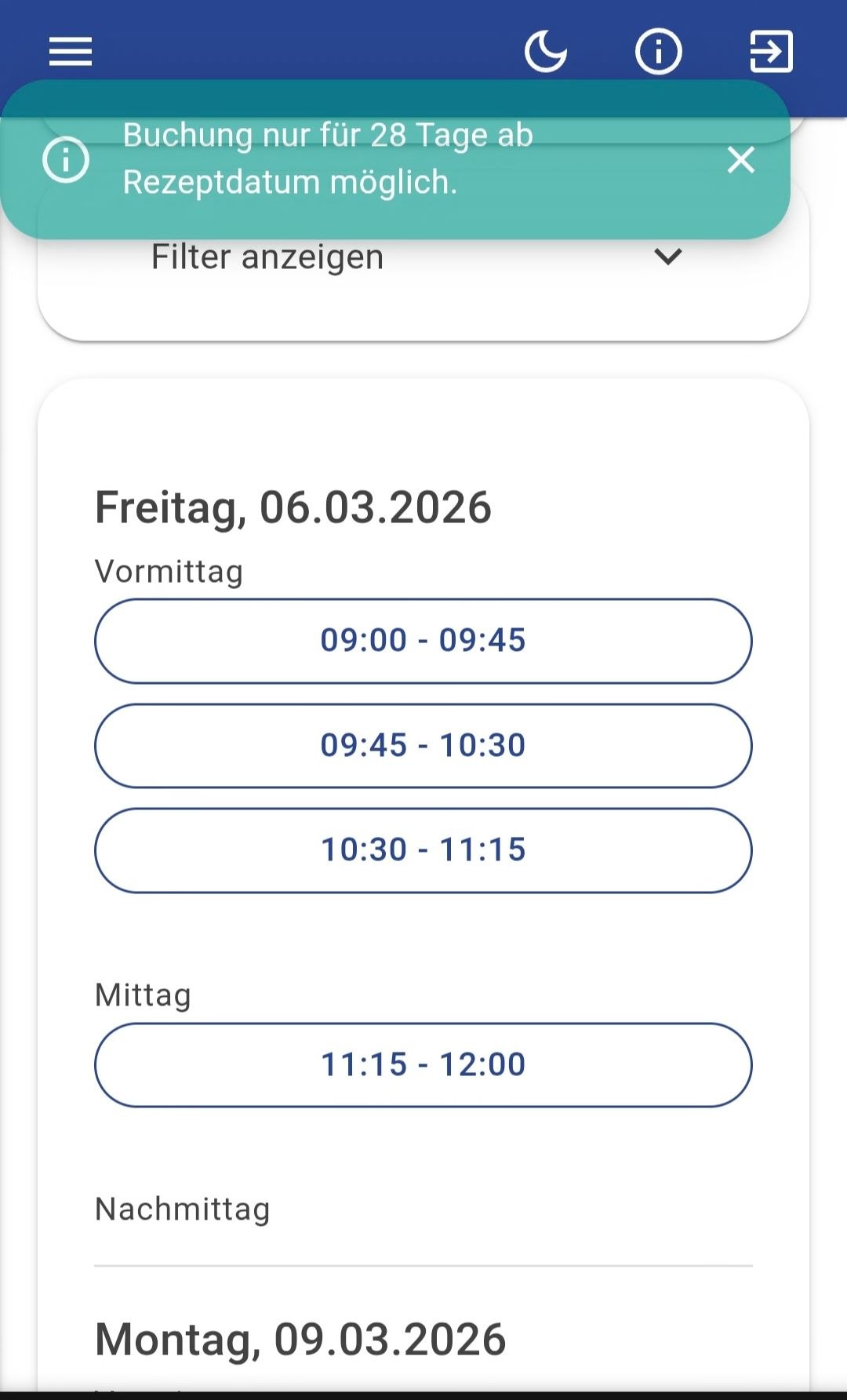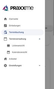 • Danach hat er diese Praxis im Menüpunkt „Terminbuchung“ zur Auswahl.