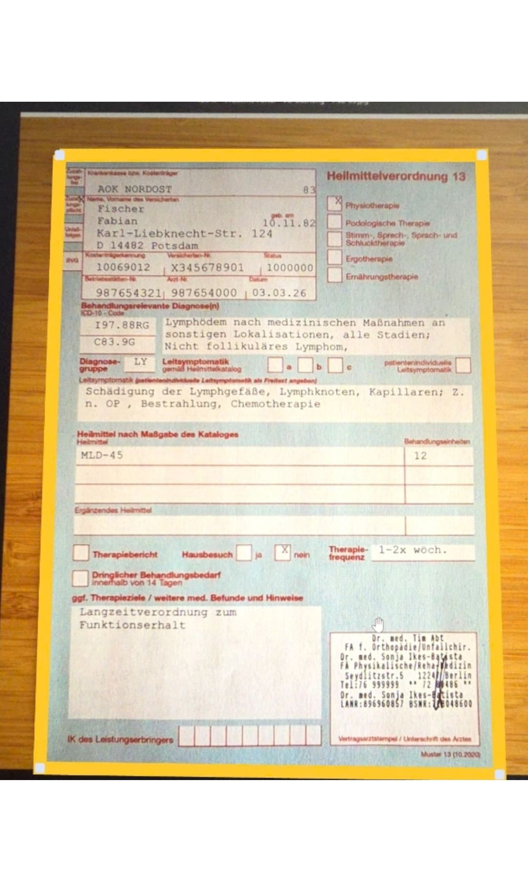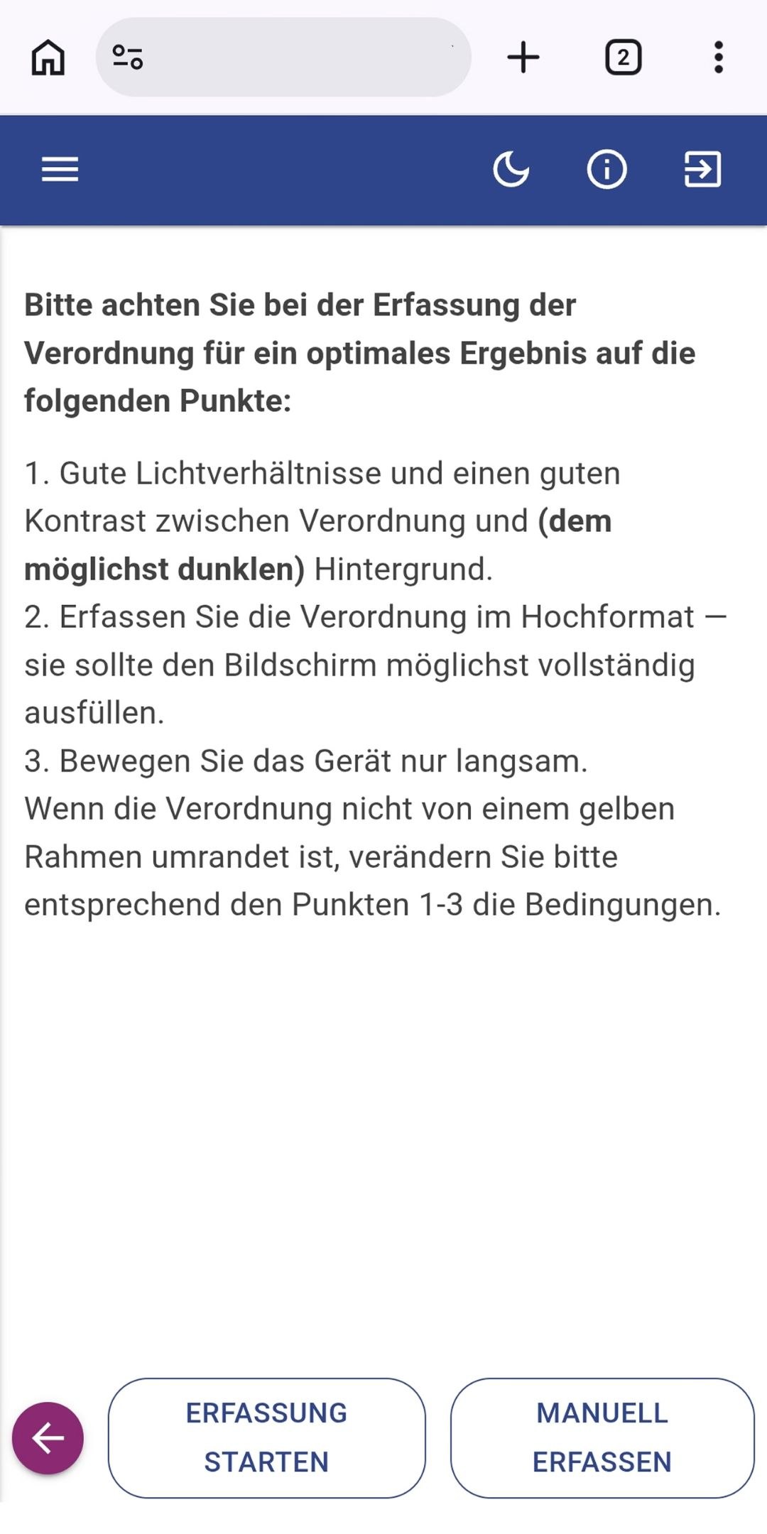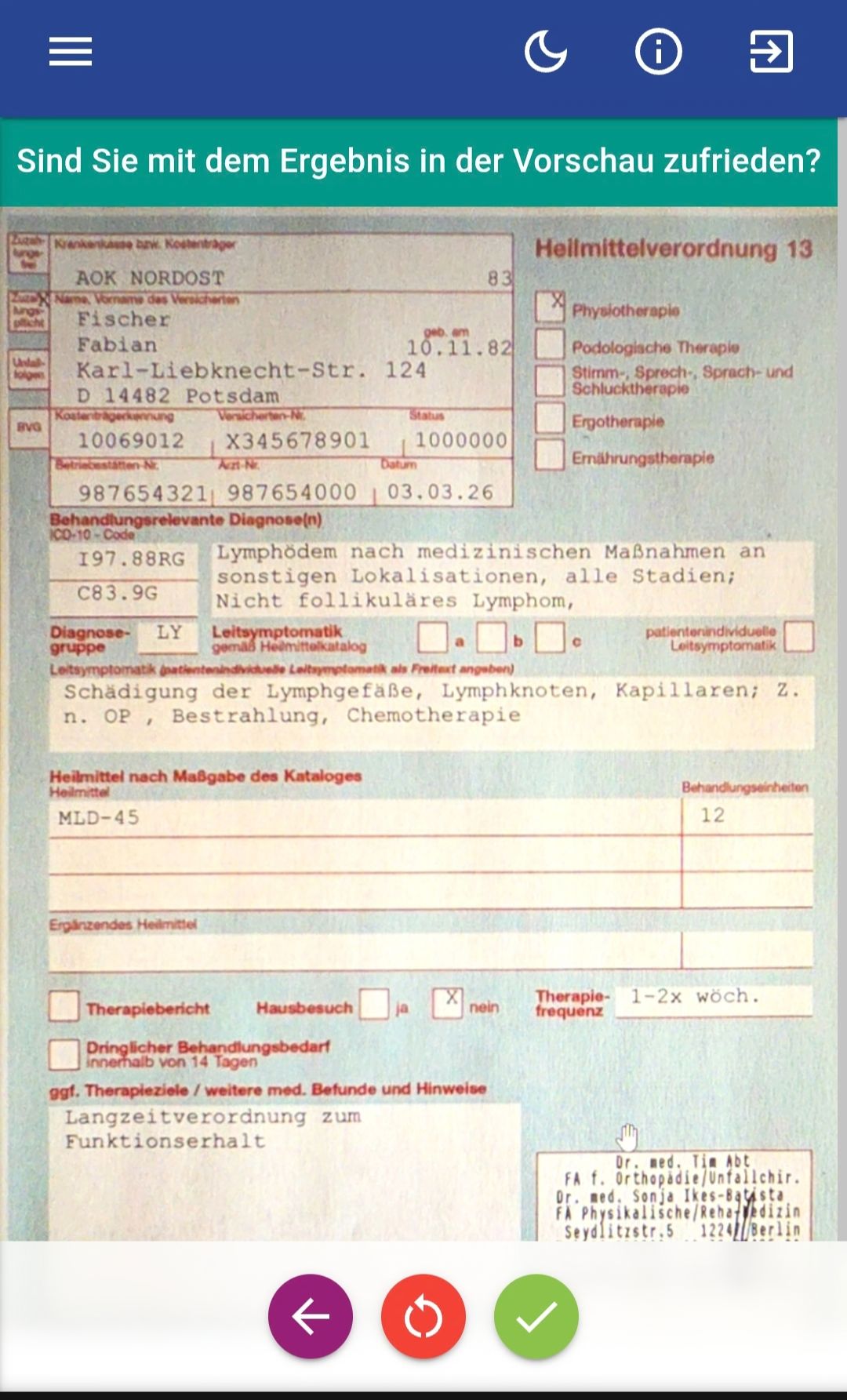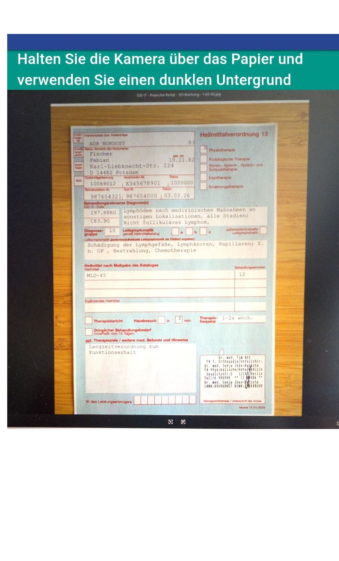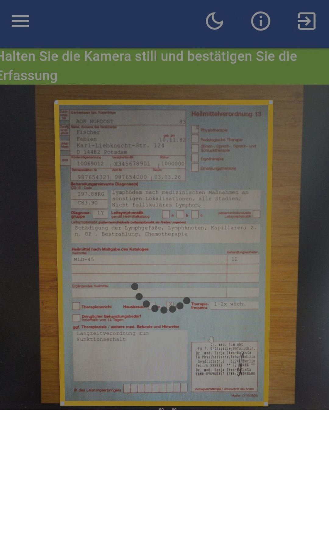• Im Falle eines Termins mit Verordnung kann er die Verordnung hochladen oder mit der Kamera einscannen.